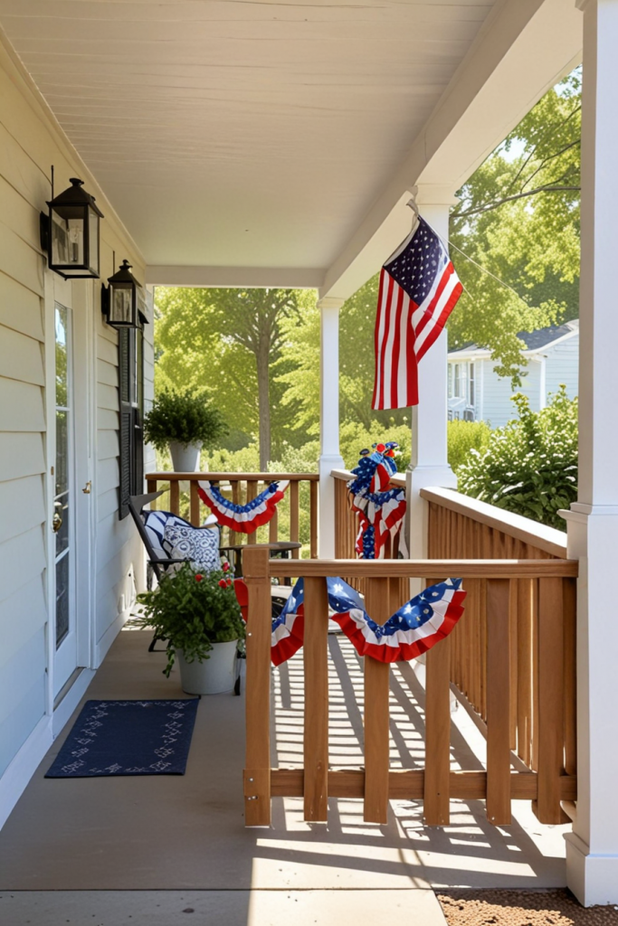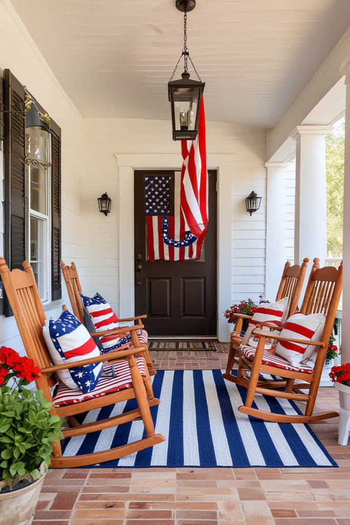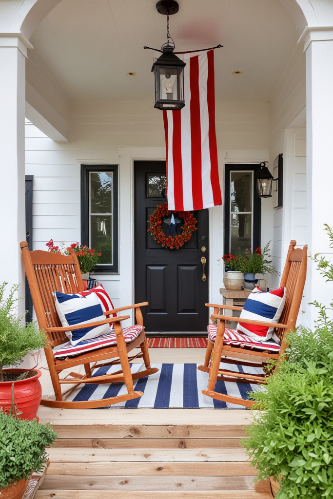 Deck the entrance of your home with a delightful patriotic themed porch that offers classic American décor. Use striped seat or rocking chairs cushions, red and navy blue pillows, and a small side table with either a star themed lantern or a vase of white daisies. Add a flag themed rug underneath and a “Welcome” sign in bold Americana colors. This is easy to add and perfect for the festive season.