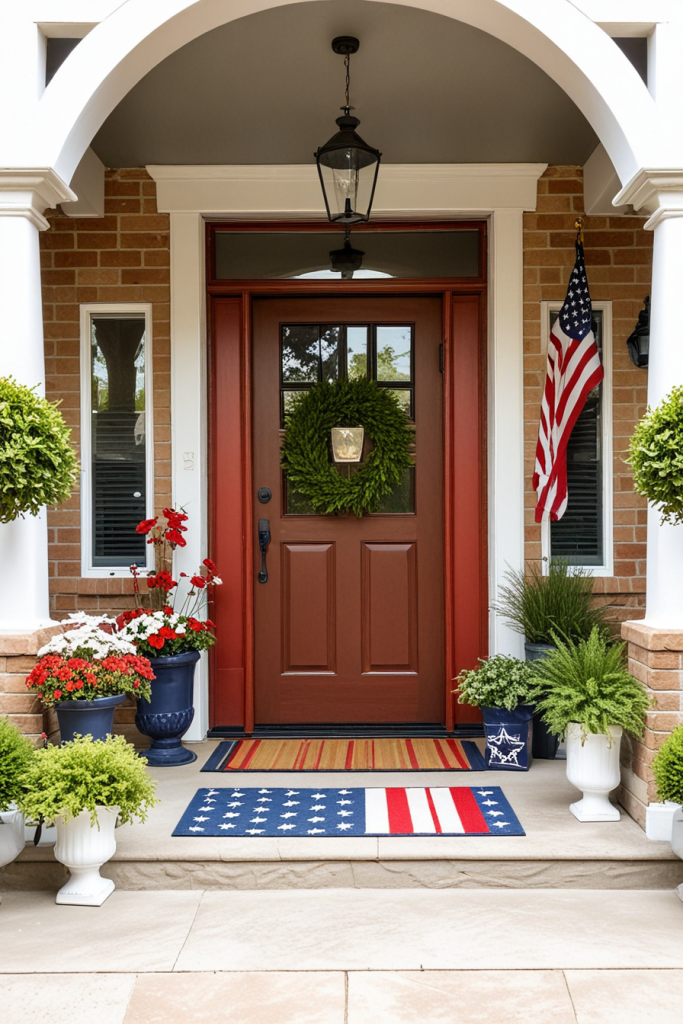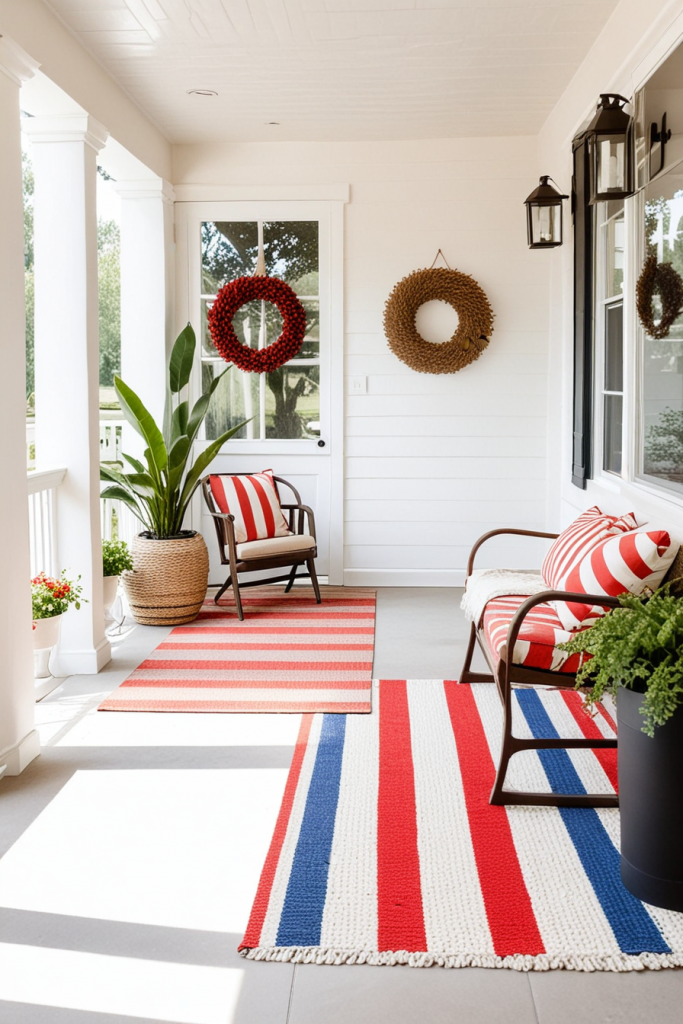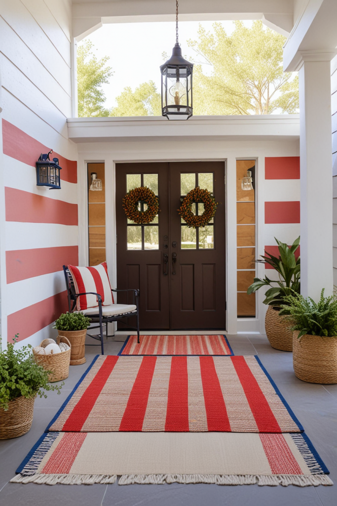 For a more dynamic look with a touch of patriotism, layer doormats and area rugs in different designs. Try placing a small American flag print rug on top of a larger jute or striped base rug in red, white, and blue. This suggestion works great for indoor entryways as well as outdoor patios. It’s a straightforward way to incorporate holiday themes without overly decorating the space.