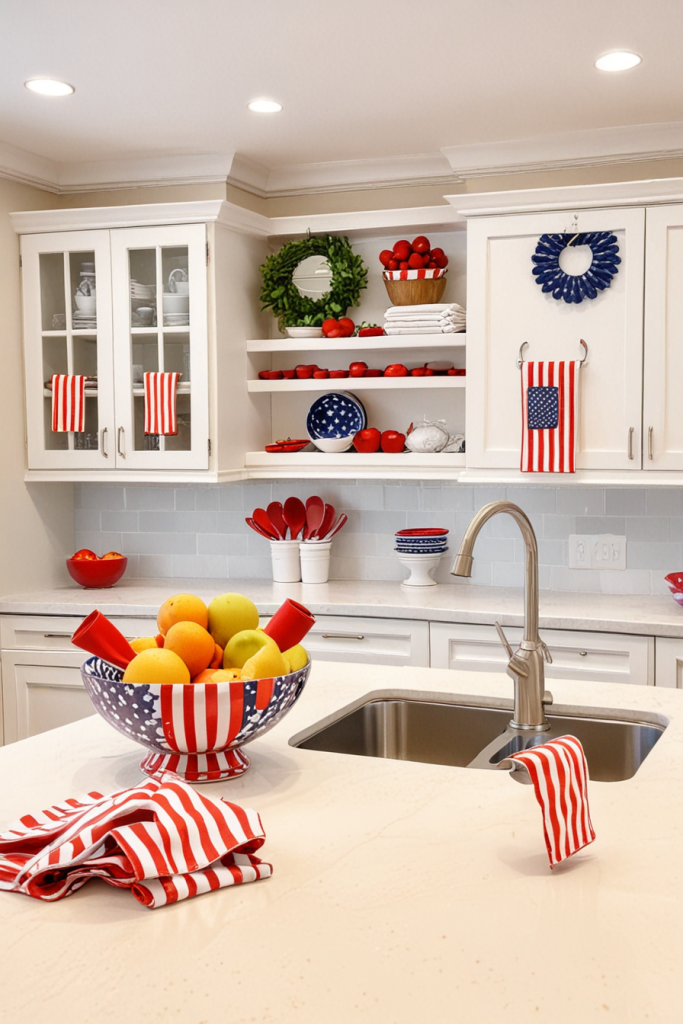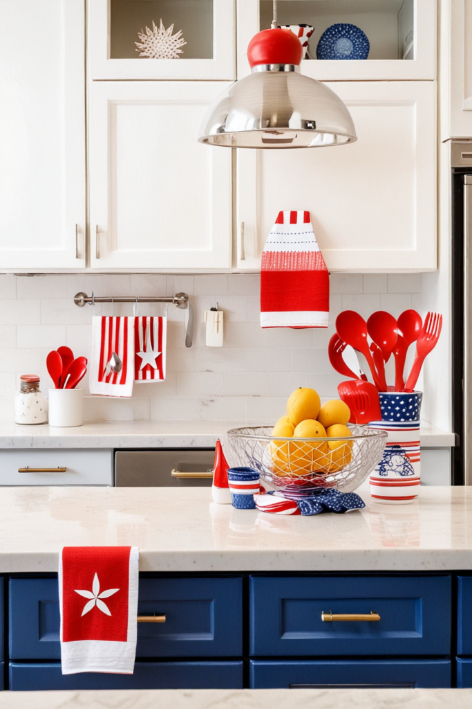 Decking the kitchen with accent towels and wipe holders in red, blue, and white along with cutlery and utensils takes it up a notch. Place a bowl of strawberries and blueberries on the counter or fill clear jars with layered candies themed colors. Simple changes also make a difference such as star-shaped goblets, themed oven mitts, and star-shaped cutting boards.