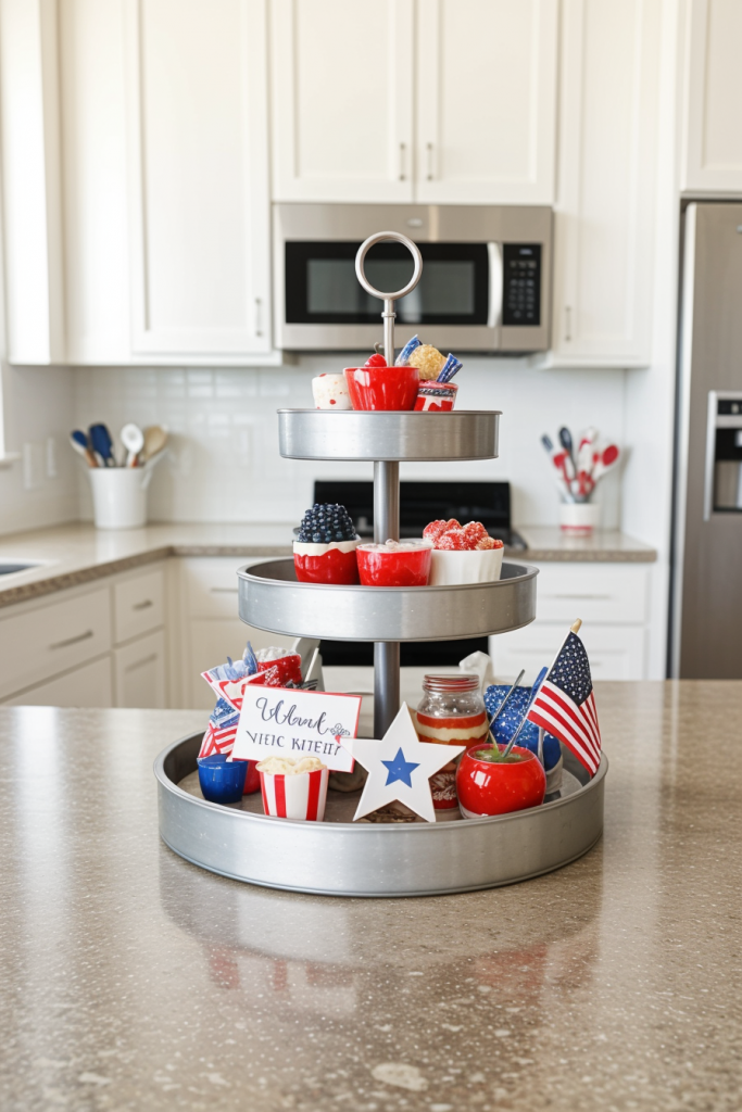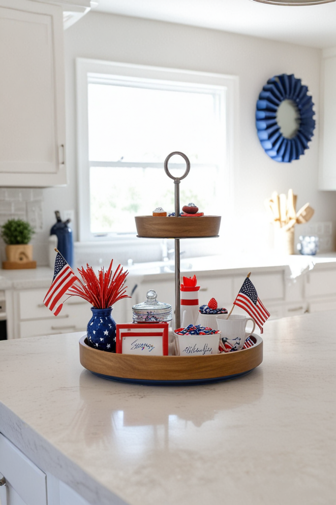Tiered trays are an excellent way to incorporate themed decor without taking away from the aesthetic of the space. Use mini American flags, decorative trucks, star banners, and Let Freedom Ring signs to capture the theme. This design is perfect for kitchen islands, entryway tables, coffee bars and can be adjusted to fit any style.