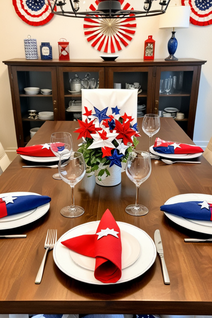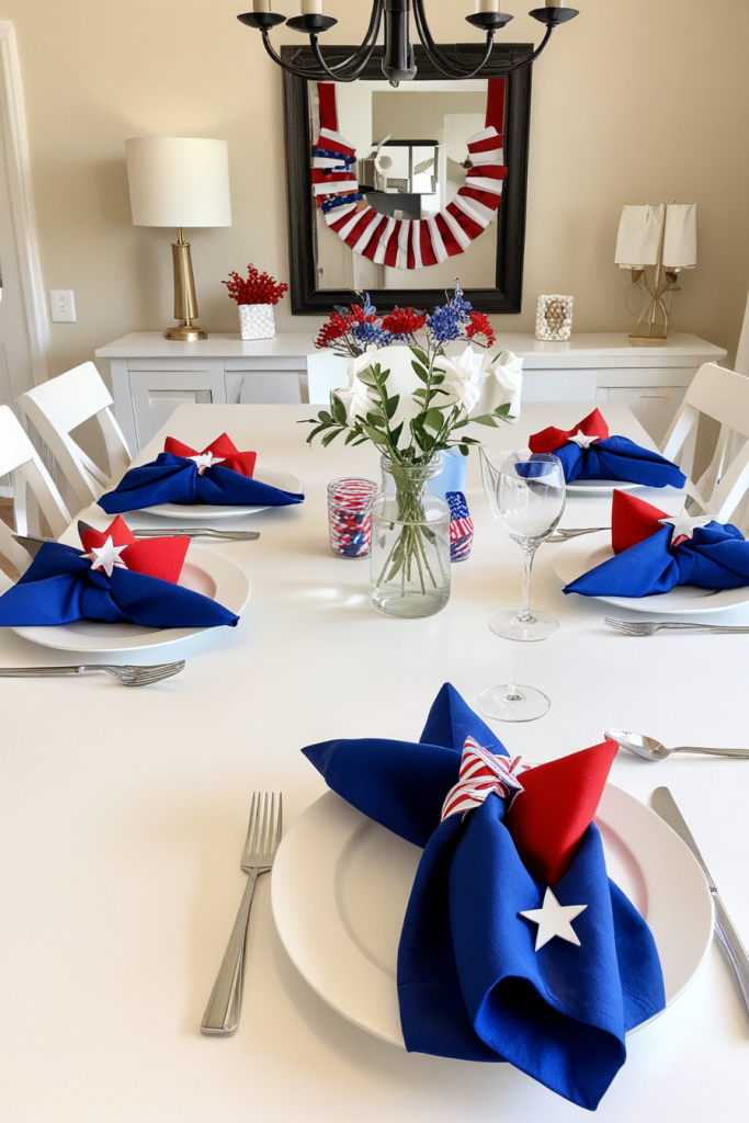 Enhance your tablescape with strategically placed beautifully folded napkins of red, white, and blue. Folds in the shape of stars, rosettes, or tiny flags set in pockets can be added to every setting. For a polished finishing touch, match them with elegant golden ribbon napkin rings. This attention to detail demonstrates elegance and sophistication even on the simplest tables.