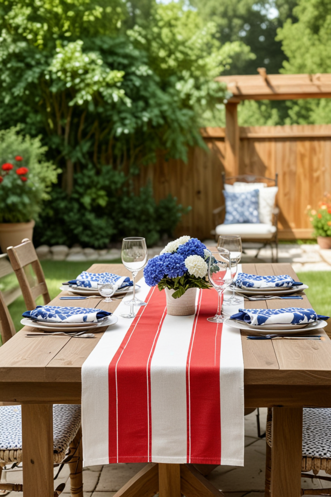 Dress your tables with patriotic table runners displaying abstract or stars and stripes patterns in red, white, and blue. These table runners can be paired with crisp and starched napkins in blue or white, creating texture for indoor and outdoor settings. Best of all, these table runners can be reused each year while maintaining cohesion within the decor.