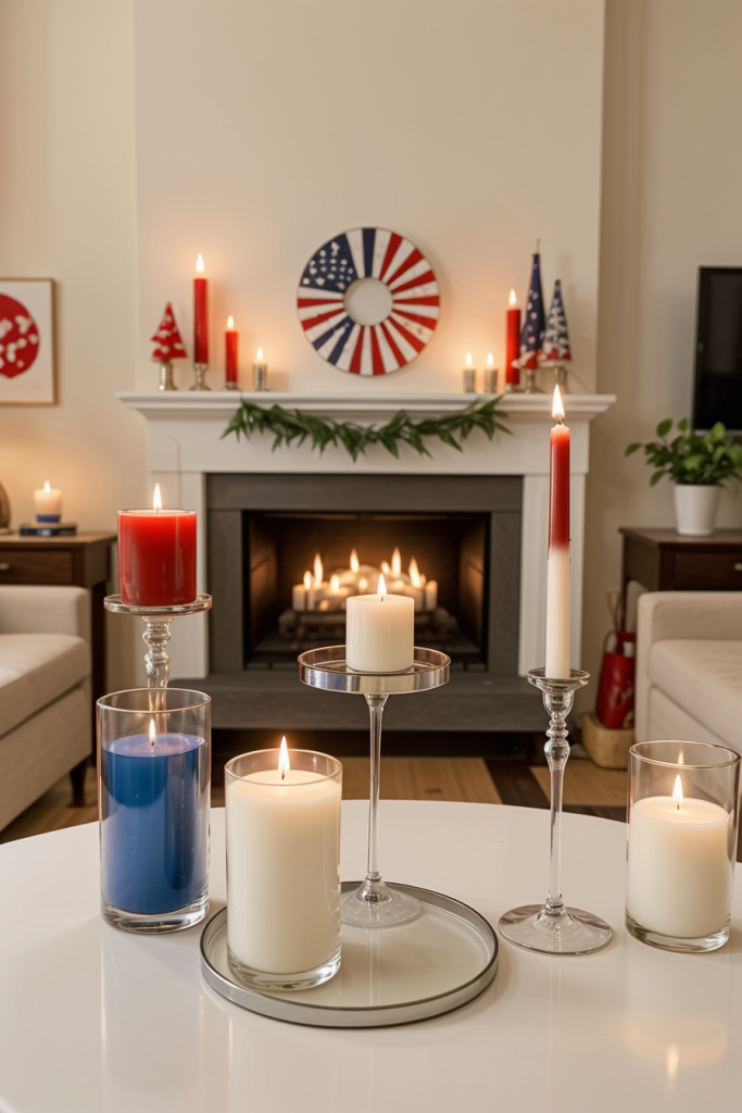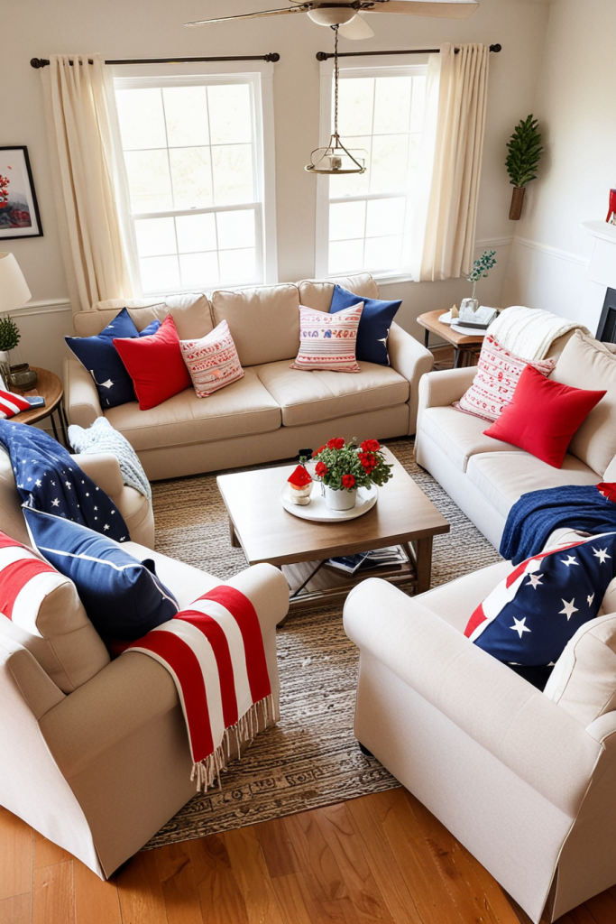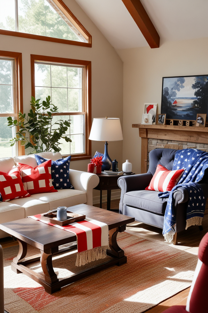 Replace everyday throw pillows and blankets with ones in red, white, and blue for some effortless cozy and patriotic interior decor. For a classy touch, select fabrics that feature embroidered stars, stitched flags, or other understated motifs. These accessories suit sofas, beds, and patio furniture, making them easy to change seasonally.