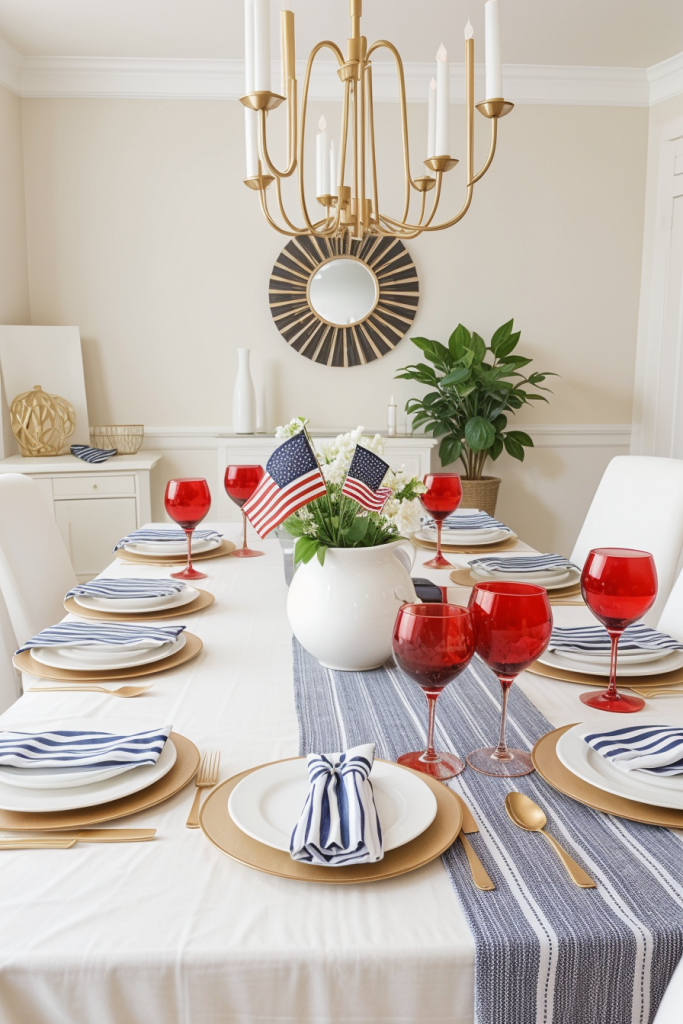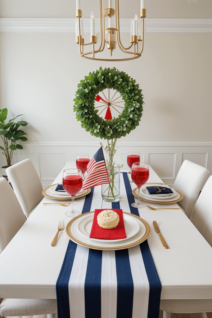 Stylishly layering a tablescape steeped in culture and polish requires few patterns and clean materials. To lay the table, start with white plates that have a navy border; add red glasses and gold cutlery for a stunning contrast. To finish the dining setting, include muted patriotic linen napkins and a geometric or striped table runner. This method enhances the holiday decor while still honoring traditions.