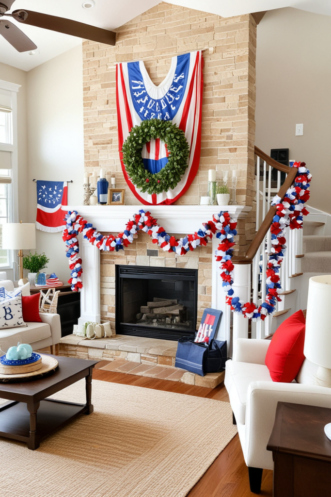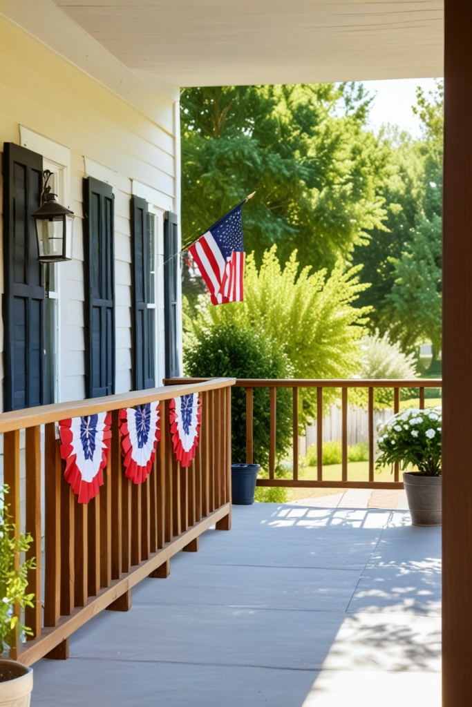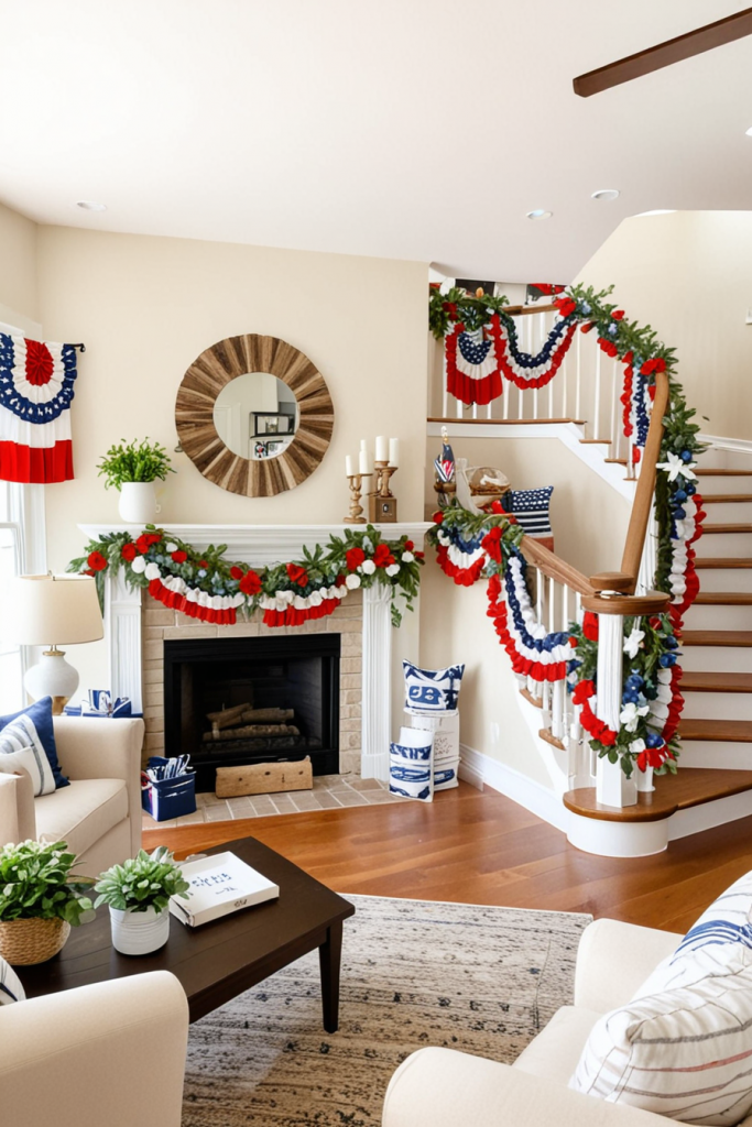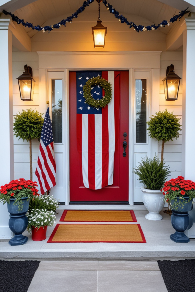 Enhance your front door by combining elements like vertical flags and wooden plaques to create bold layered stars and stripes. A doormat that fits the color scheme can be placed for a sophisticated finish. This part of the home is used for first impressions and instantly boosts the home’s spirit during national holidays.