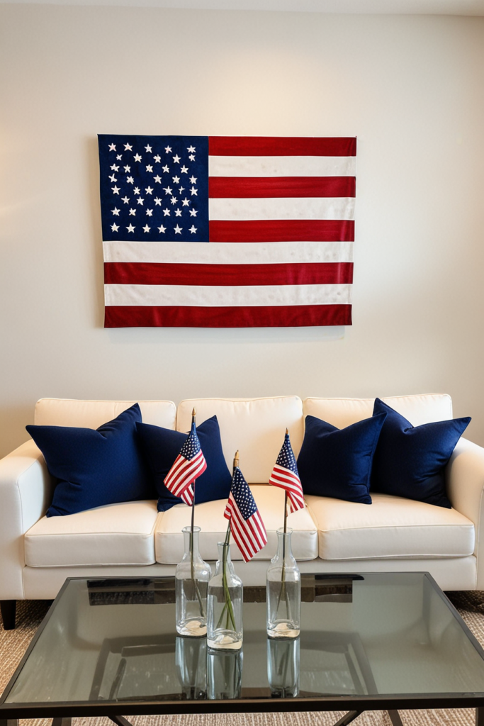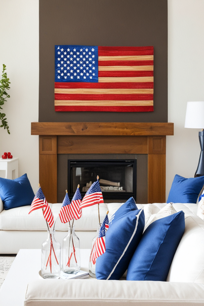 Place American flags discreetly throughout each room—mini flags in vases, flag-themed paintings on the gallery walls, or larger flags on the mantles or hung vertically behind sofas. For a more authentic look, use cotton or linen fabrics, as oppose to flags made of cheap plastic materials. This is an effective technique for bringing the theme inside and maintaining visual coherence.