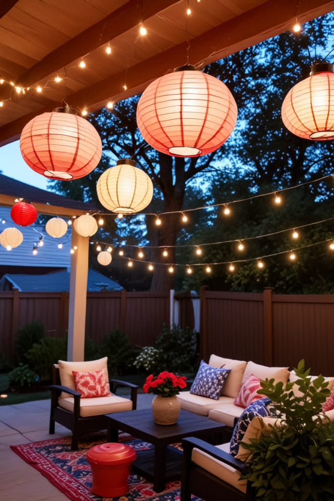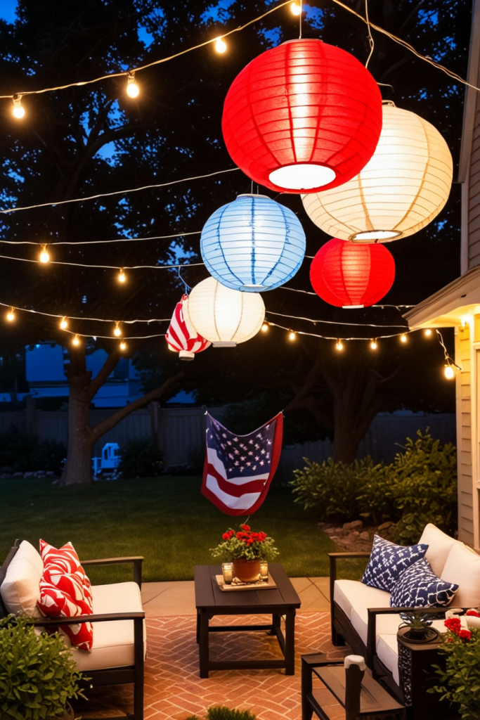 Paper lanterns in three different colors of red, white and blue can be hung over patios, dining areas, or staircases to make any location exuberant and celebratory. To make them even more radiant during the night, add fairy lights or LED string lights. For more aesthetic appeal, using a combination of different sized lanterns will enhance visual interest.