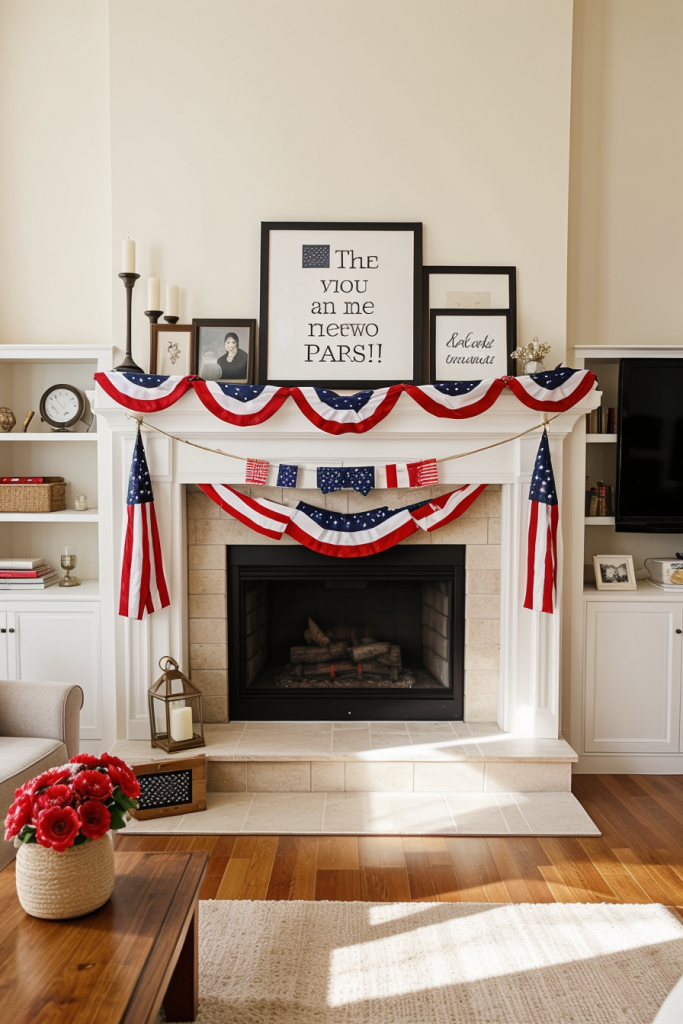 The top of your fireplace mantel can be easily adorned with festive decorations for a patriotic look. By layering bunting with red, white, and blue, candles in star patterned holders, and small framed quotes that say things like ‘Land of the Free’ can be added. Add some small firecrackers or streamer ribbons to perfect the design. This arrangement is perfect for every room in the house as it goes with the decor of both modern and old-fashioned homes.