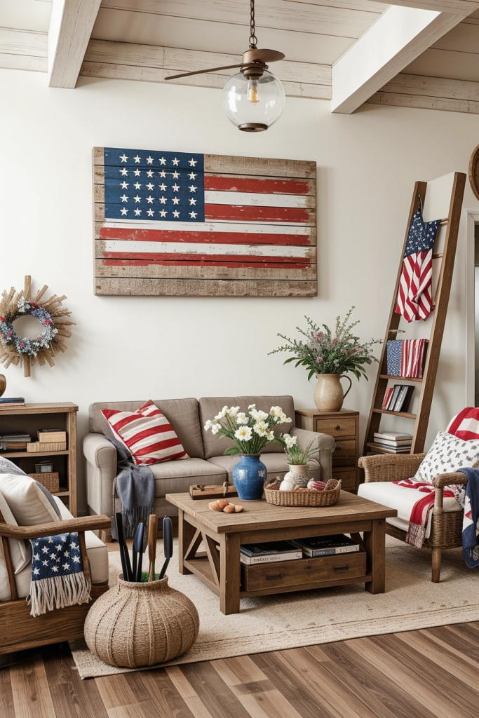 Upcycling is both artful and eco-conscious, perfectly fitting the rustic farmhouse style. From turning old ladders into blanket holders or using antique crates as book or planter holders, they can all display patriotic throws or be reused. Reclaimed wood gets transformed into flag wall art or rustic shelving. Each reclaimed piece used to celebrate 4th of July decor adds unique personality and character while remaining eco-friendly.