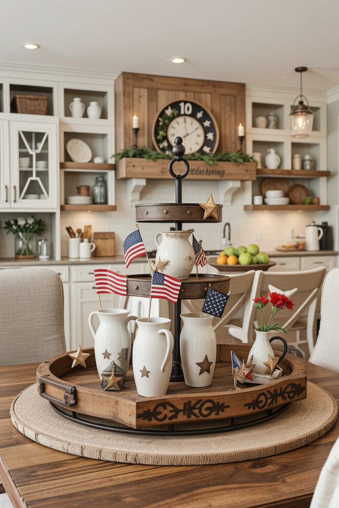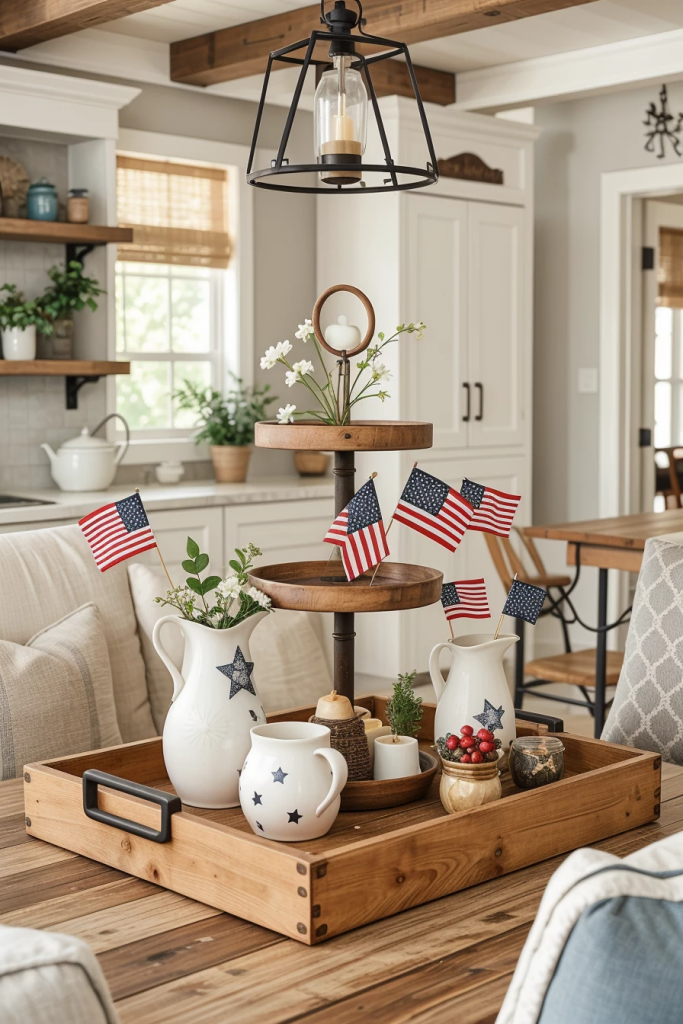 Elegant Tiered Trays with Modern Rustic 4th of July Vignettes