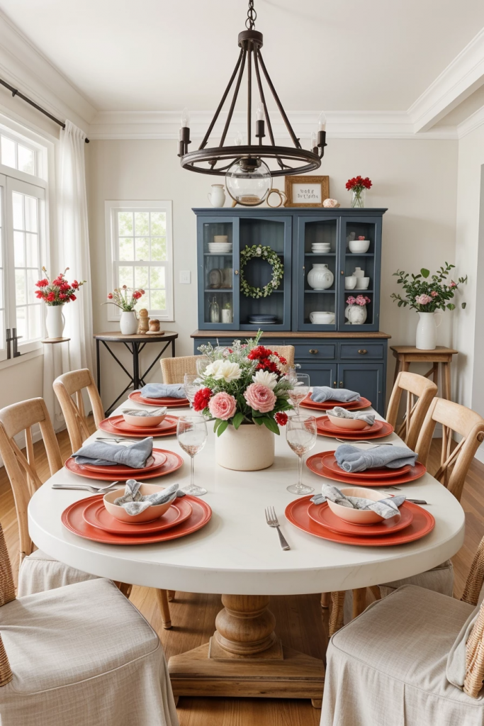 Red, White, and Blue in Soft Tones for Farmhouse Dining Rooms
