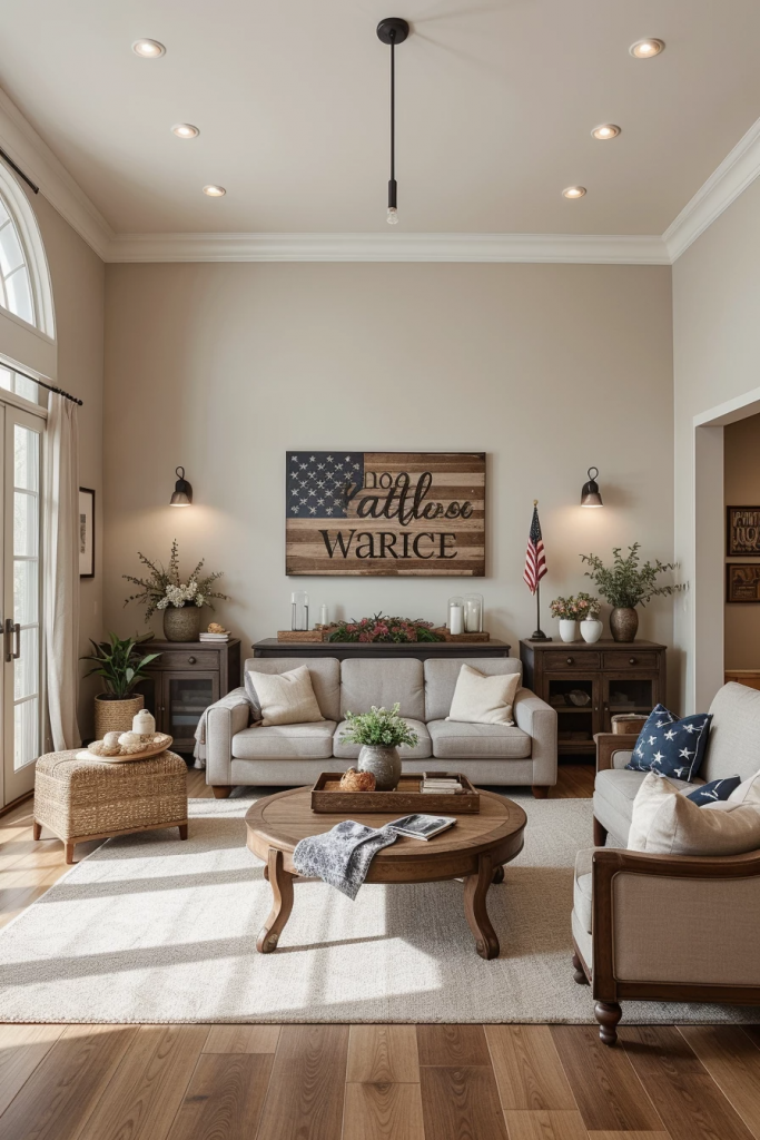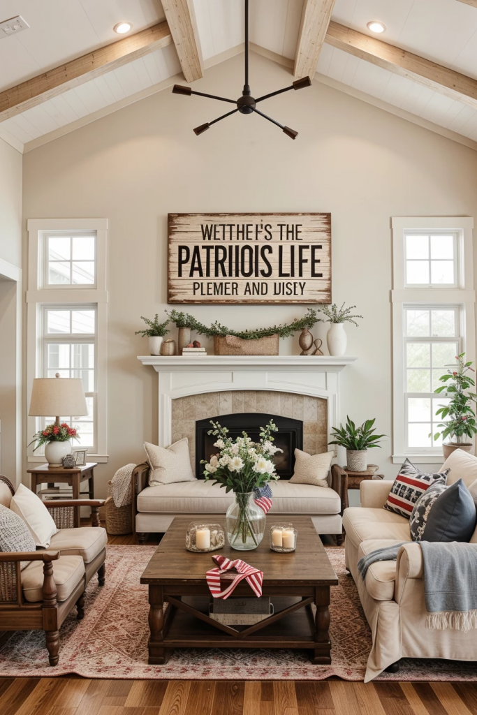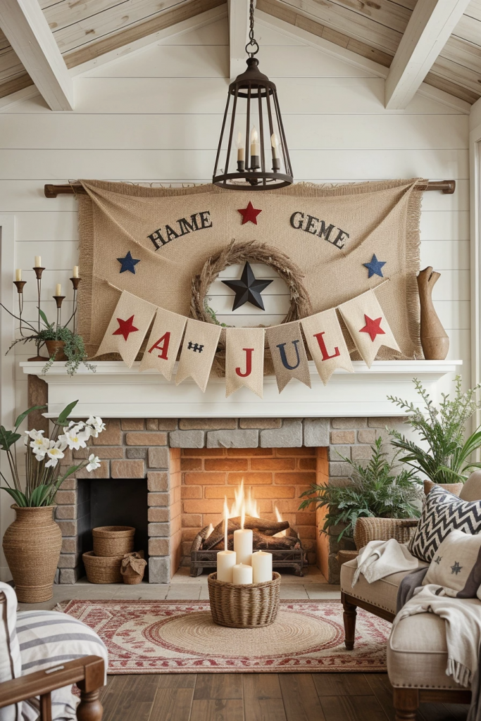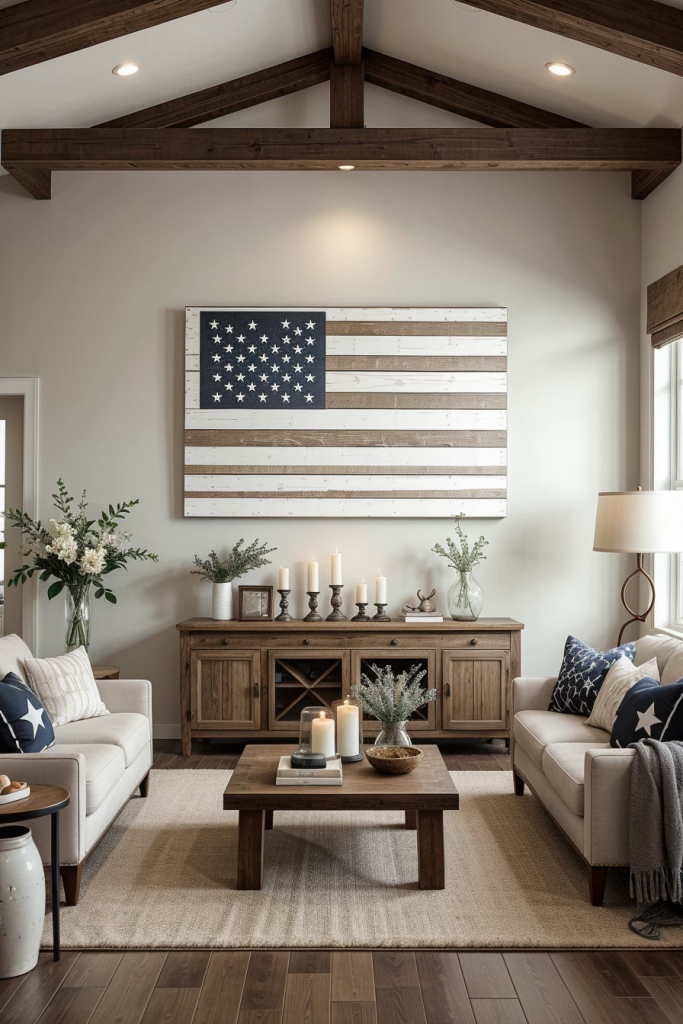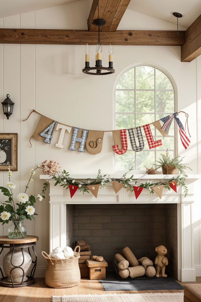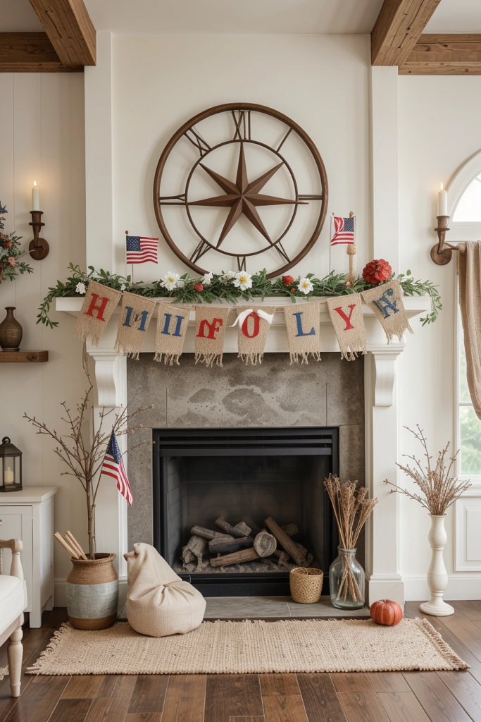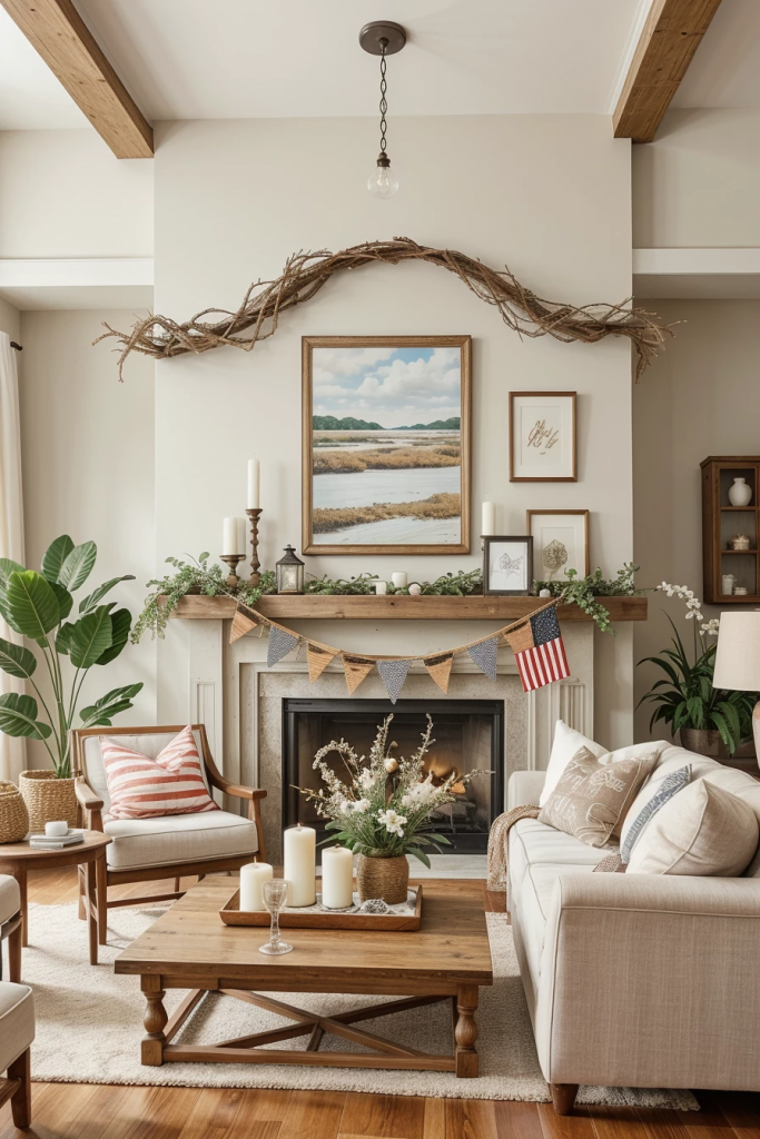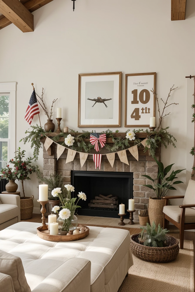 Blend nature with festivity, and your mantel will evolve into a curated patriotic focal point. Consider using driftwood garlands, dainty cream colored flags, olive and eucalyptus branches, and historic documents. For ambient glow, add some white candles or lanterns. This simple yet elegant arrangement deeply compliments modern style rustic farmhouse living rooms as it serves as a accent piece without being too gaudy for the room.