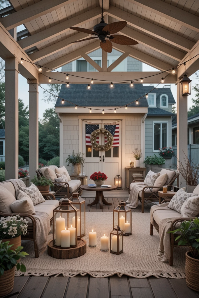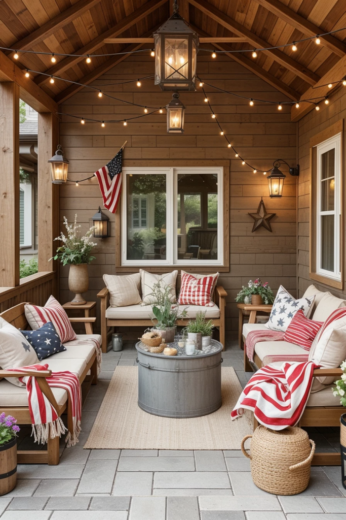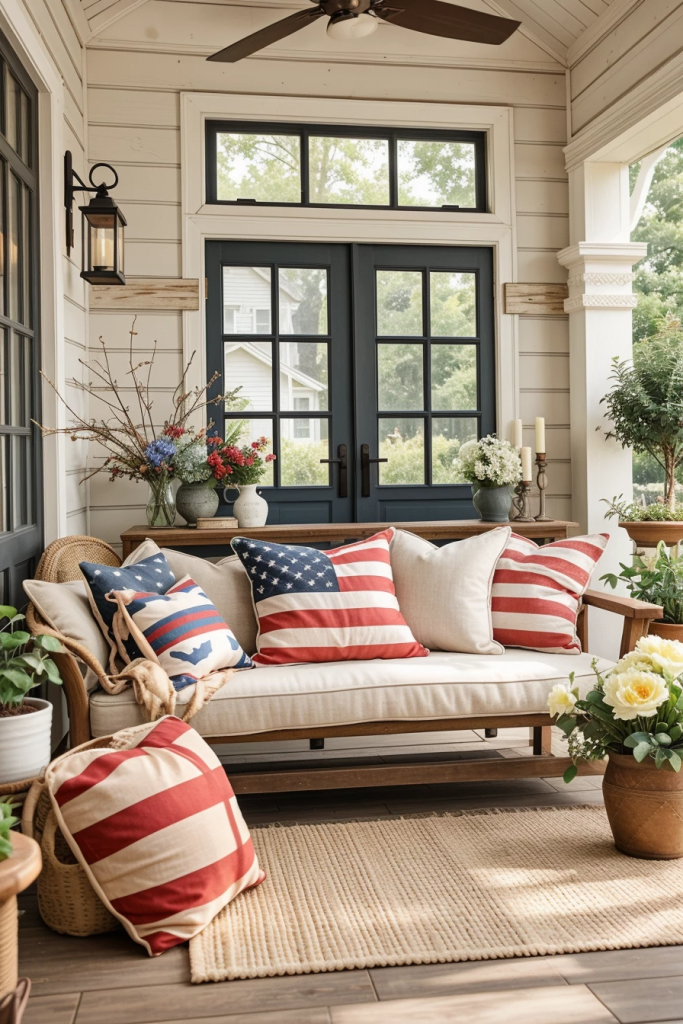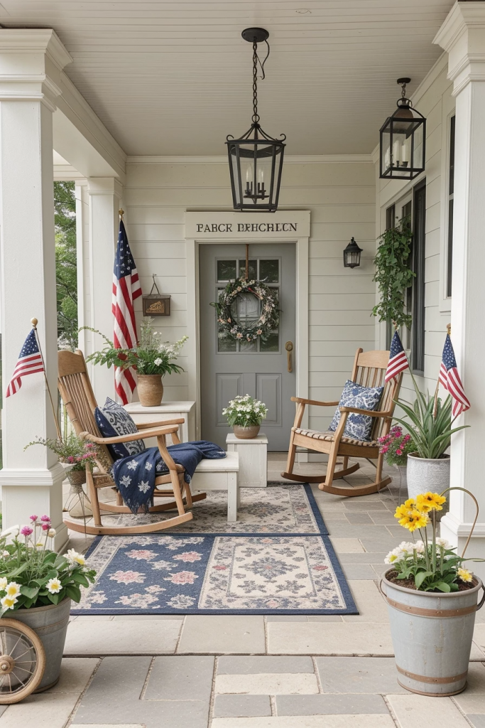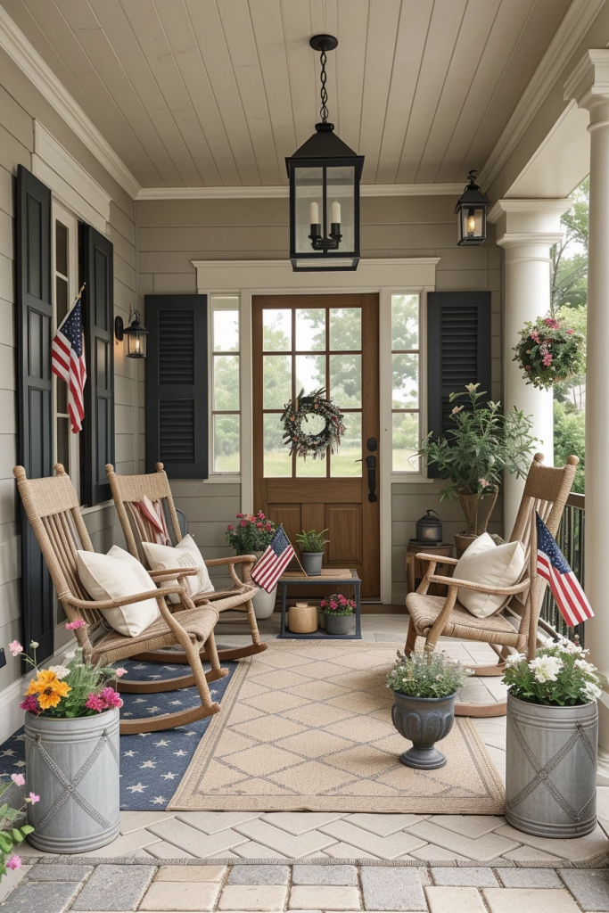 Combine rustic elements with subtle patriotic touches to your front porch as a warm Independence Day decor using lightly weathered rocking chairs in a vintage style, cream and navy accent rugs, and galvanized planters with miniature American flags. Incorporate soft throw pillows with delicate stars and stripes and star-etched pillows for an easy sophistication while maintaining lowered silohplacing. All these chosen elements avoid the stereotypical decor and instead give a refreshing take on gentle minimalism. Maintain the ease and warmth within your color palette.