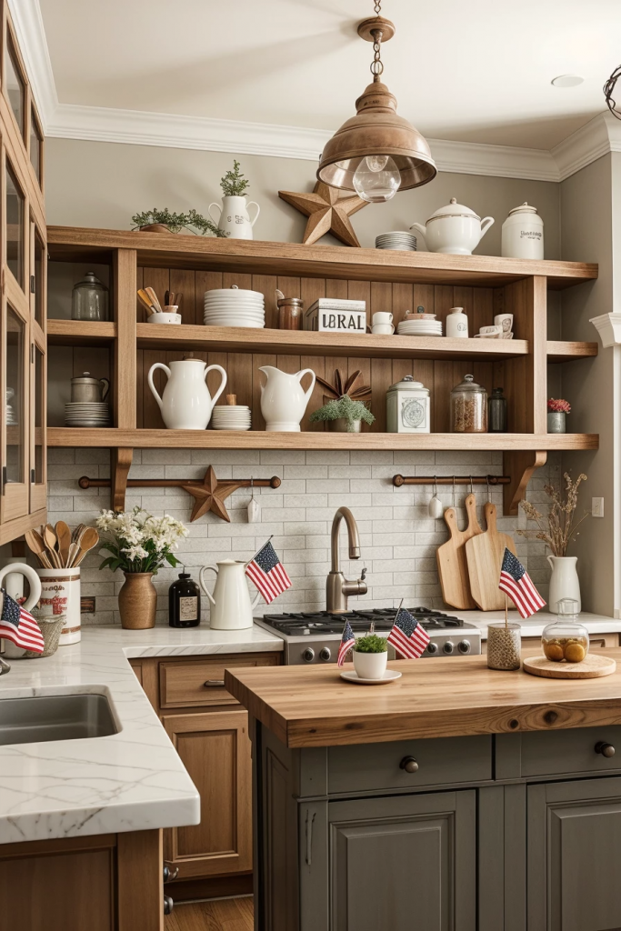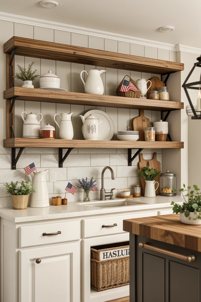 Neutral 4th of July Shelf Styling in Farmhouse Kitchens