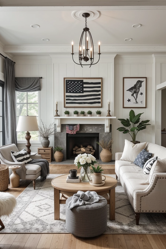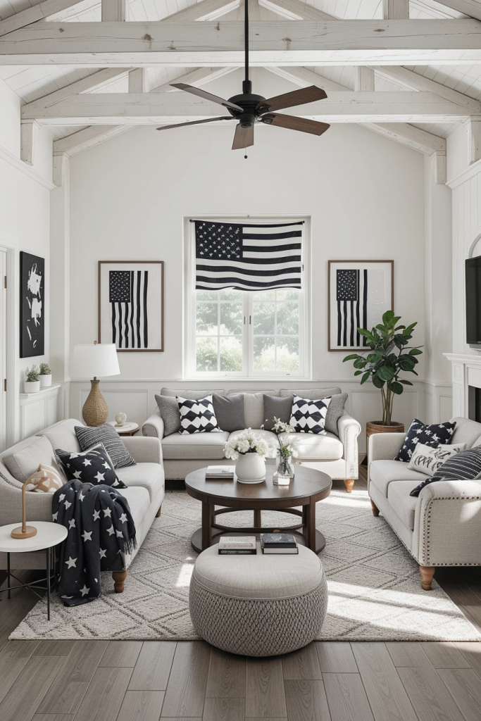People who appreciate minimalism and neutral colors combination would love the monochrome 4th of July decor which is simple yet strikingly effective. You can consider using whitewashed wooden accessories, soft gray throws with star motifs, and black-and-white American flag prints. This look keeps with the understated farmhouse style while paying homage to the celebration. This type of design, through its absence of decoration, is meticulously crafted and still manages to be bold.
