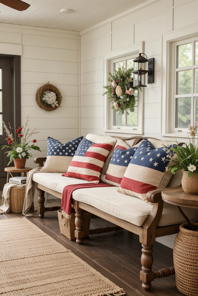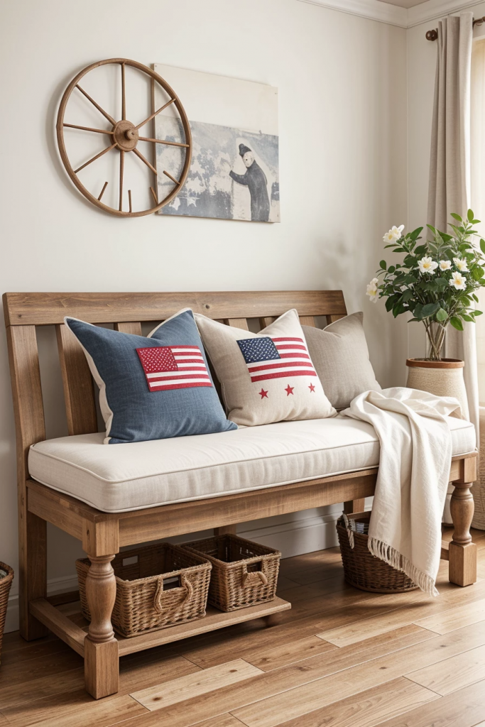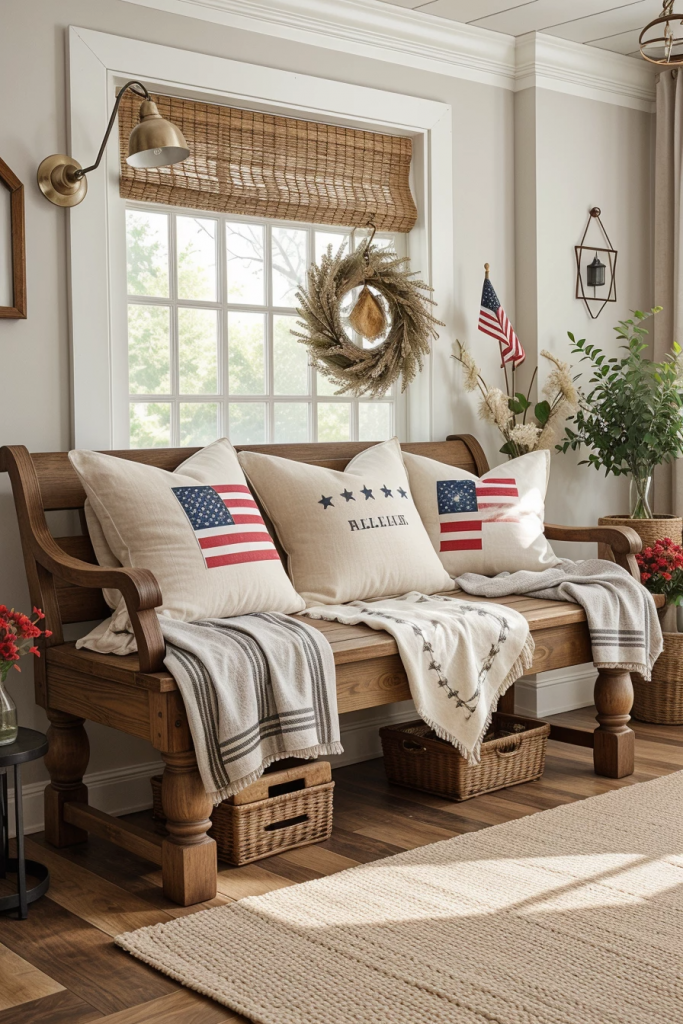 Besides being useful, benches, located in the entryways, mudrooms, or porches, make great places to sit which makes them perfect for using decorative pillows. Position light throws in either cream or soft indigo, along with natural linen or canvas pillows that feature delicately muted stars, stripes, or embroidered flags. This setup is easy to dismantle after the holiday since it offers both function and festivity at once. Avoid cluttering the rest of the area in order to maximize visual impact.