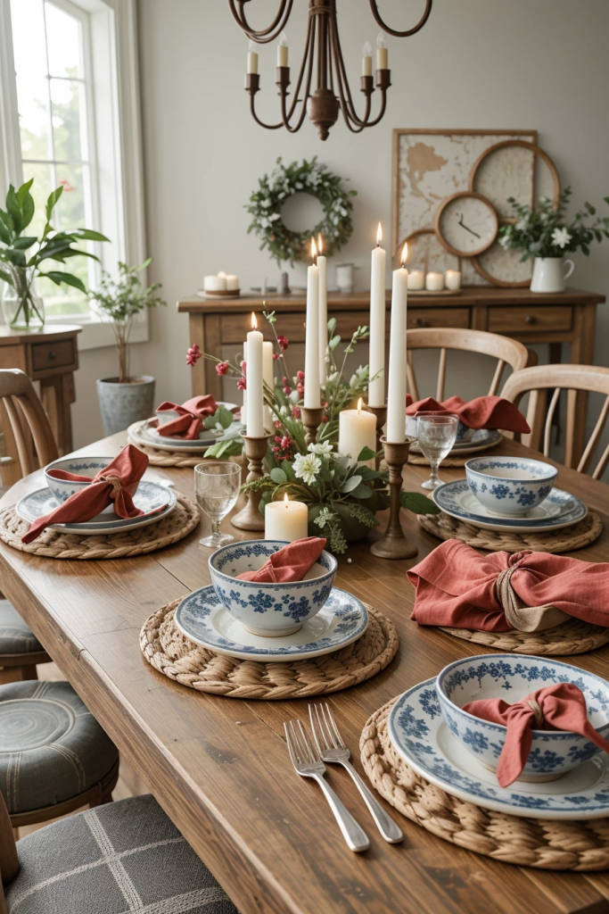 Swap out the plastic plates for beautiful blue and white ones complemented by red napkins or flowers for an elegant twist. Rattan or wood chargers exude rustic charm when paired with clay or enamel tableware. This enhances the decor without overshadowing the feel. Add delicate slender candles and soft greenery for a gentle touch. It’s an exquisite setup that is understated yet elevates the celebration, perfect for farmhouse dining.