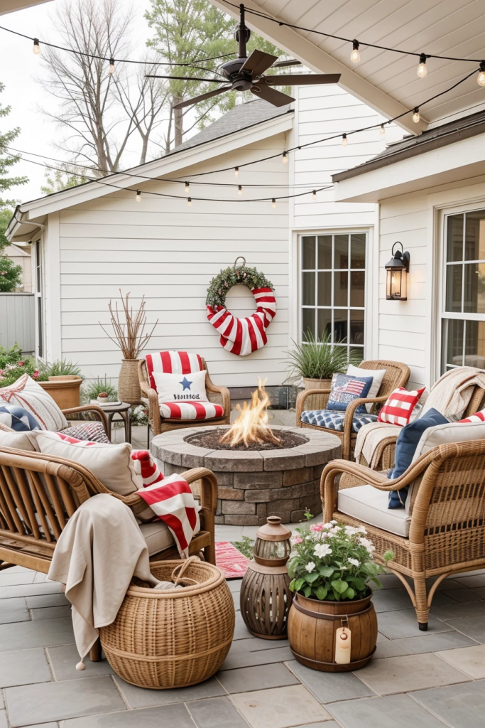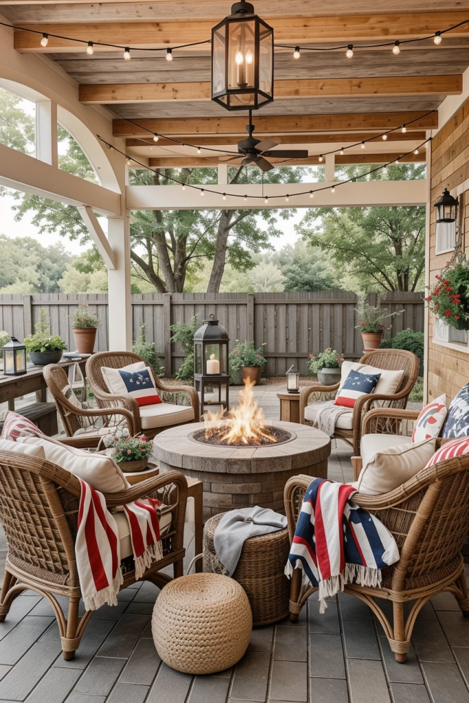 Fire Pit Area Decor with Cozy Patriotic Blankets and Seating