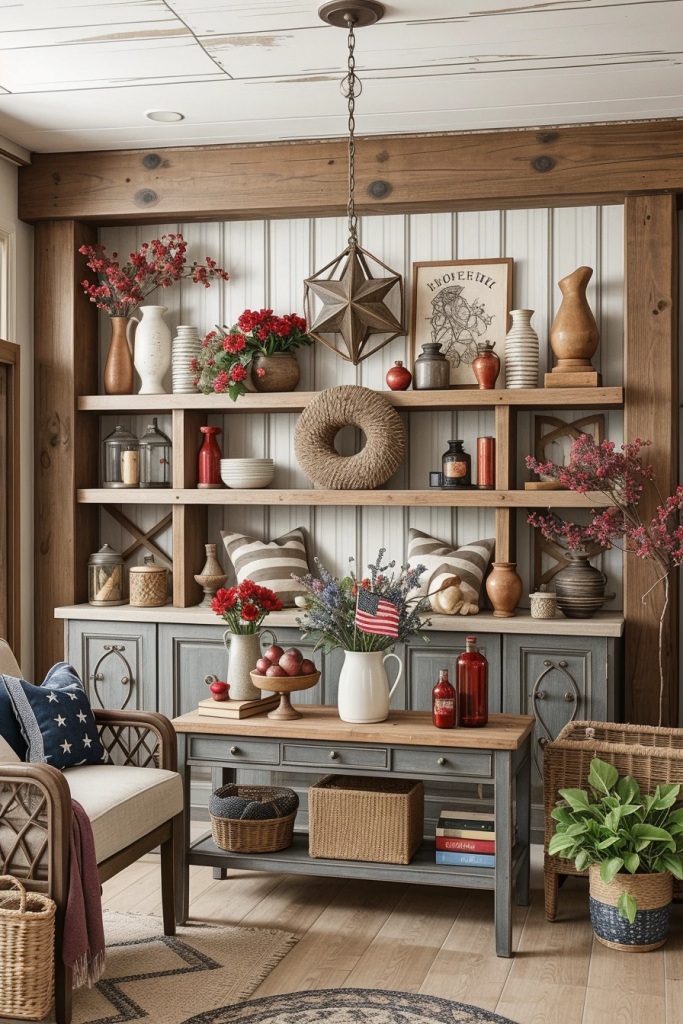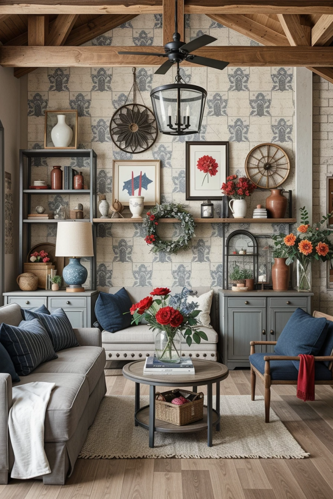 Farmhouse designs often include galvanized metal, which is simple to incorporate into holiday decor. Fill soft red and blue accents—like artificial berries, navy napkins, or vintage labels—into metal pitchers, planters, and trays. For console tables and shelves, cluster objects of different heights to add dimension. This combination of texture and color brings forth understated farmhouse charm while maintaining a strong sense of patriotism.