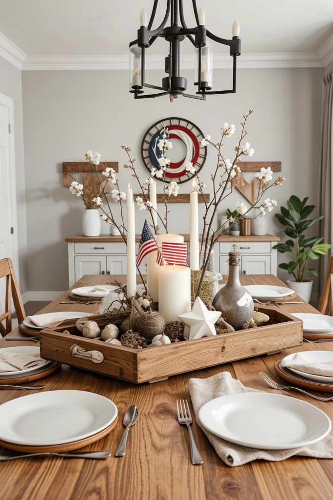 A minimalist approach makes a breathtaking statement just as much as an overly extravagant centerpiece would make. The centerpiece for a rustic farmhouse’s charm can be accentuated by pillar candles, dried cotton or wheat, and a wood tray, all arranged with care and precision. For an ounce of 4th of July magic, add a small ceramic star or a flag-themed napkin ring. This approach is best suited for people who appreciate understated beauty, poise, and tranquil elegance.