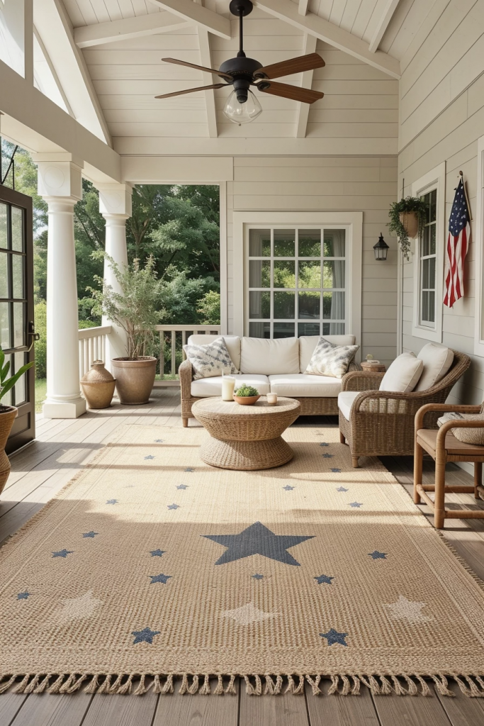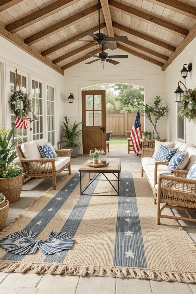 To enhance your festive look, choose natural fiber rugs with quiet Americana aesthetics (stars, stripes, or worn flag patterns). Jute and sisal rugs are perfect accents for indoor and outdoor spaces. For interiors with wood floors and exteriors with stone patios, select designs in soft navy, tan, and cream. These rugs serve the dual purpose of adding warmth, texture, and even a touch of patriotism, while still maintaining the modern farmhouse look.
