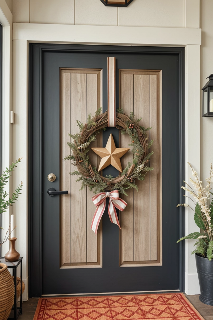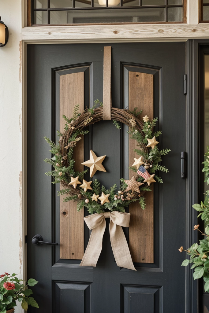 A wreath is a traditional part of 4th of July decor, but this time go for farmhouse textures and muted tones. Picture off-white ribbons, dried lavender, grapevine bases, and small wooden stars hidden in between the greenery. Hang it on a salvaged wood door or a matte black door for contrast. The outcome is simple yet elegant with quietly striking patriotic charm. This approach is organic yet refined.