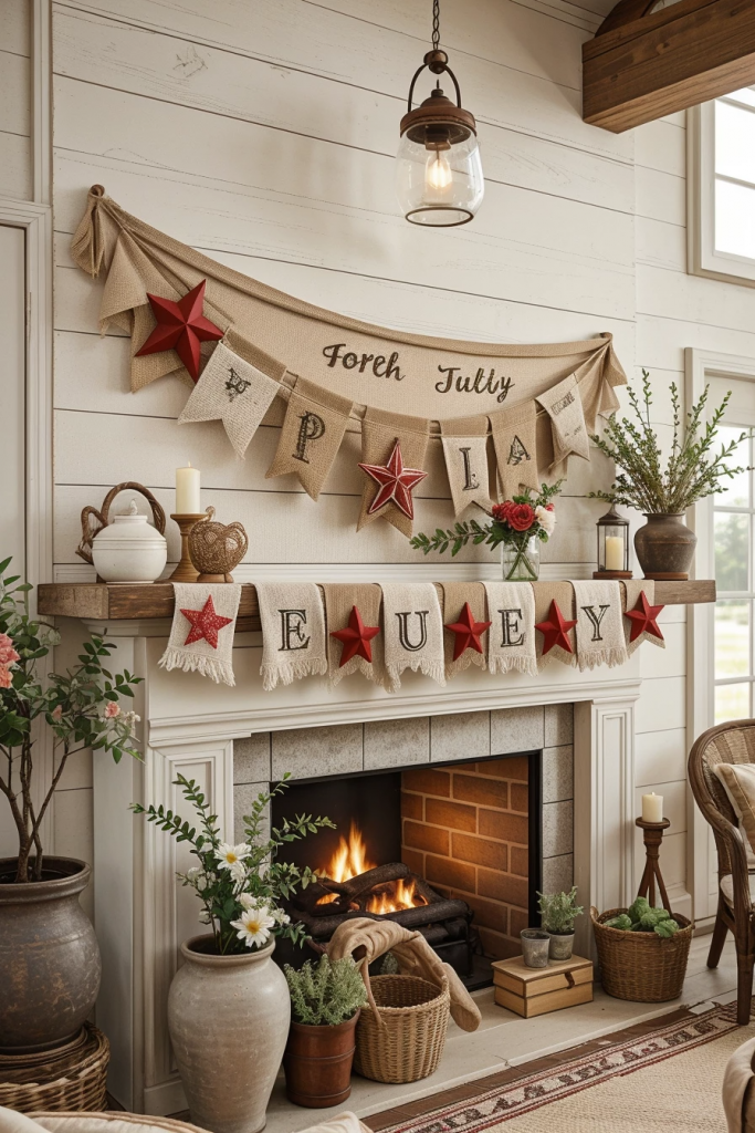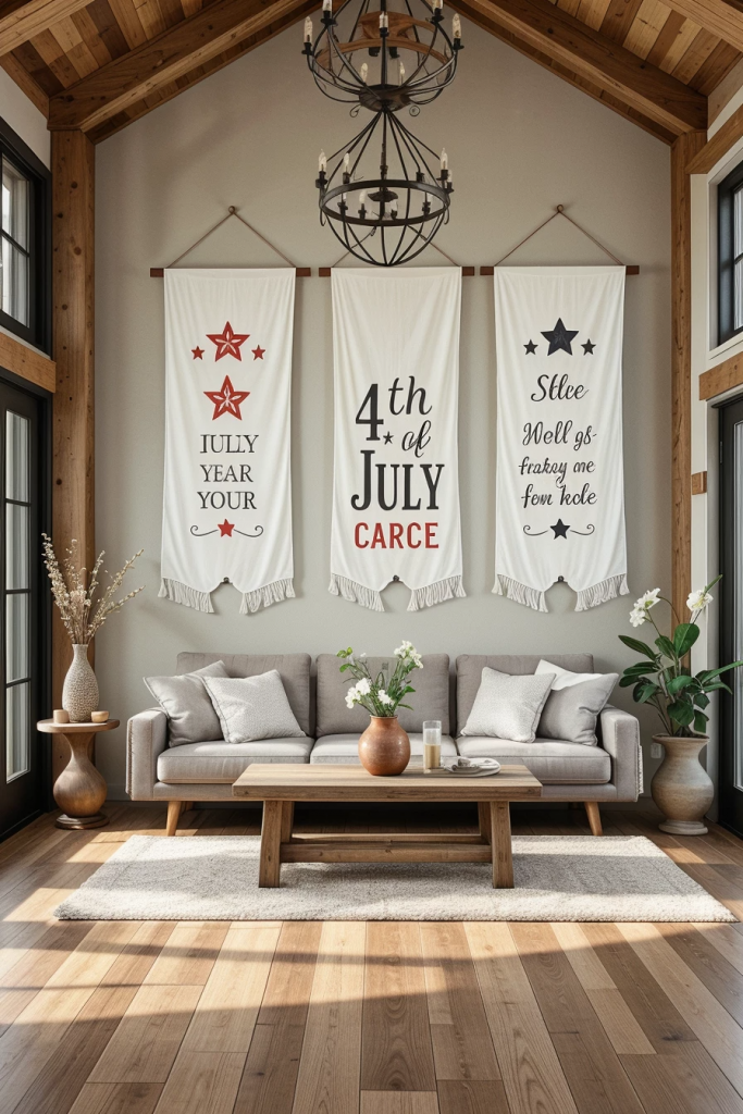 Burlap and linen banners exhibit the gorgeous fabric textures as well as workmanship skills and imagination for a chic Americana look. Use soft stars, stripes, and stitched wording on natural toned fabric instead of bold graphics. These banners can be hung over stair railings, fireplaces mantels, and porch beams. The sensation they provide and their simple beauty capture rustic farmhouse coziness without being overly exuberant. For added character, choose layered lengths with frayed edges.