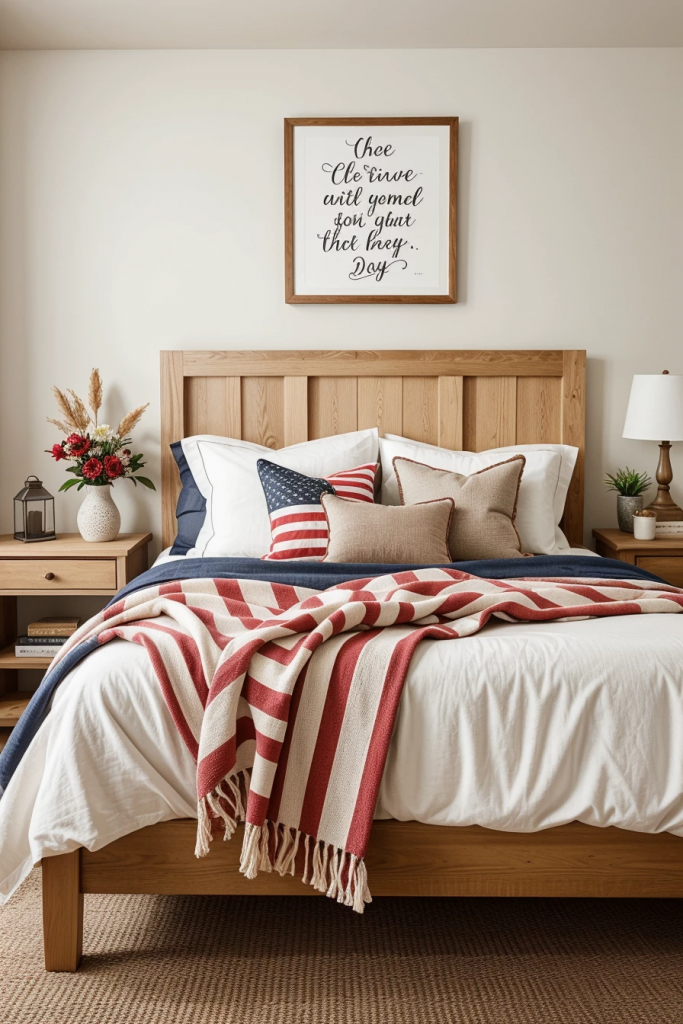 Transform your farmhouse bedroom into a patriotic sanctuary by incorporating elegant touches such as striped throw blankets, navy and cream bedding, or framed word art quotes placed above the headboard. Pick accessories and accents that coordinate with the design of your room. Achieve calm holiday decor using natural wood furniture and lightly decorated pieces together with linen fabrics.