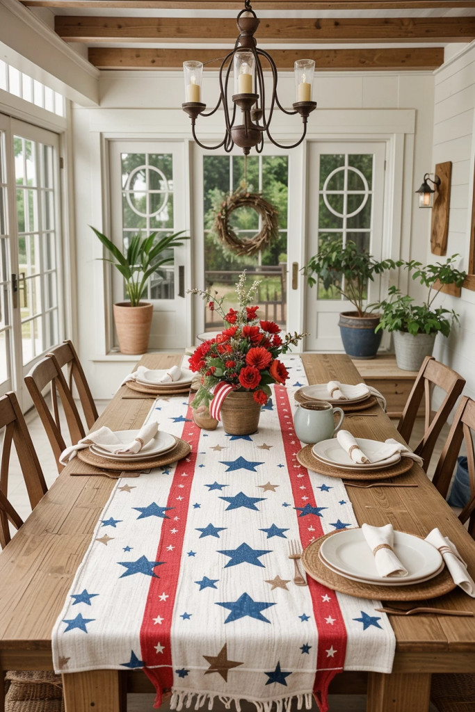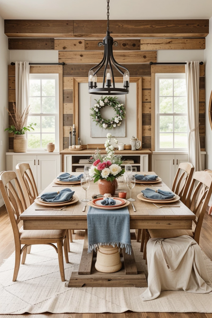 Eliminate the loud brights and instead use soft faded hues of red, blue, and white. Imagine denim blue napkins, and red chalk chargers, with cream dinner plates. This color combination gives your farmhouse dining room a timeless elegance. To complete the look, use wooden decor and neutral linen tablecloths. This style keeps the coziness of your home while still embracing patriotic spirit.