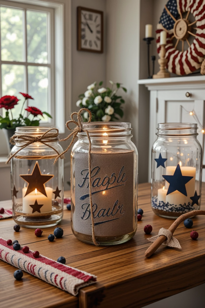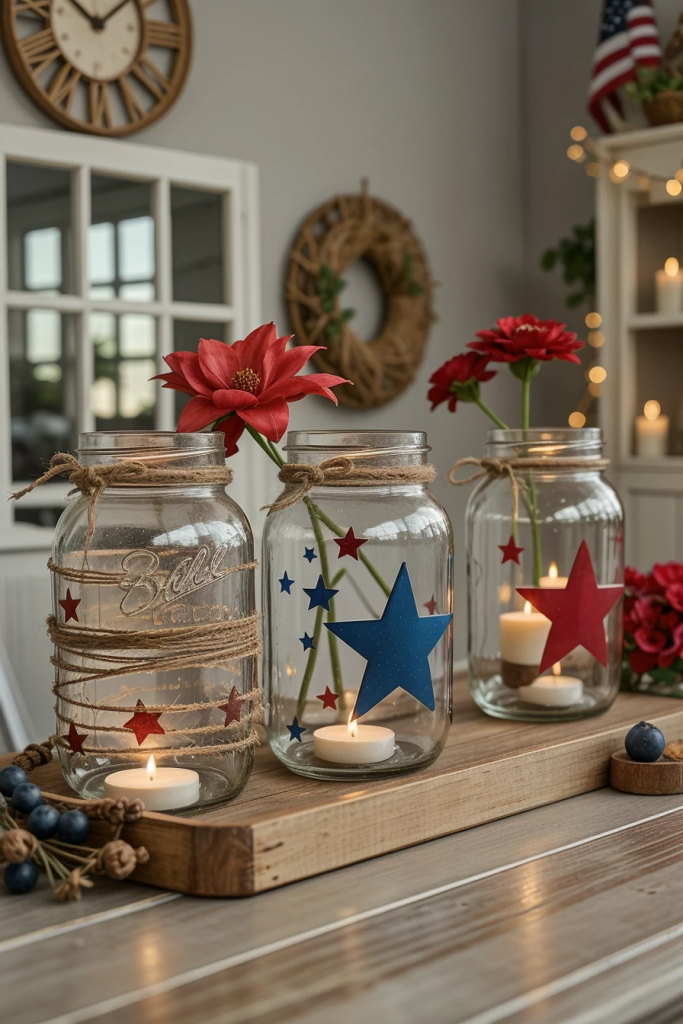 Patriotic Mason Jar Candle Holders with a Rustic Touch