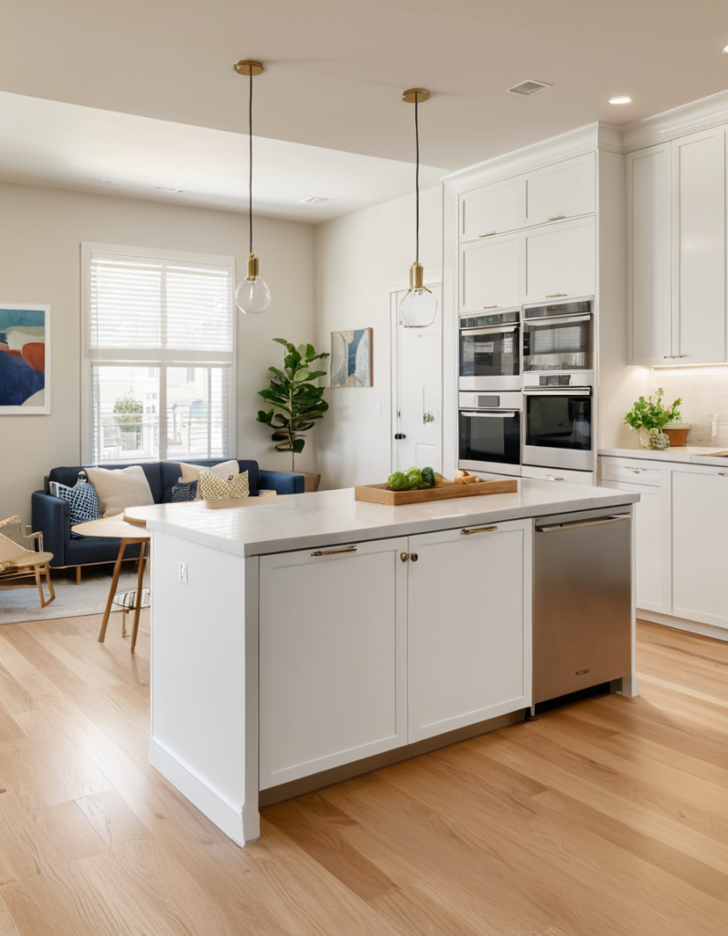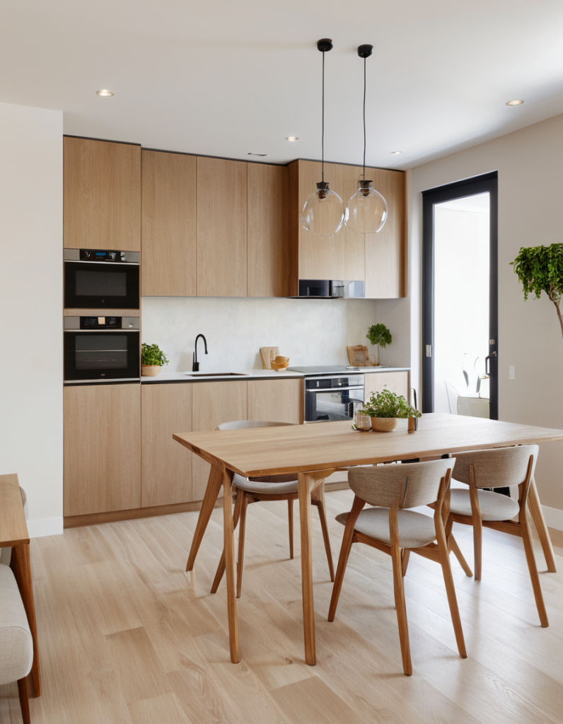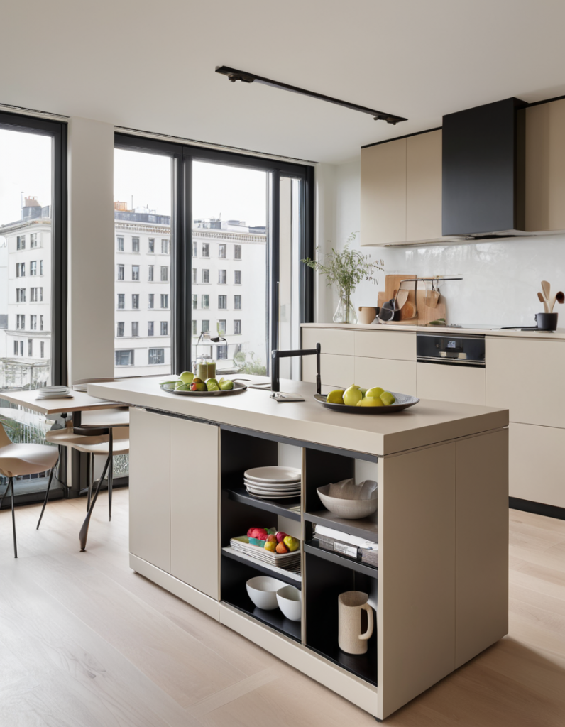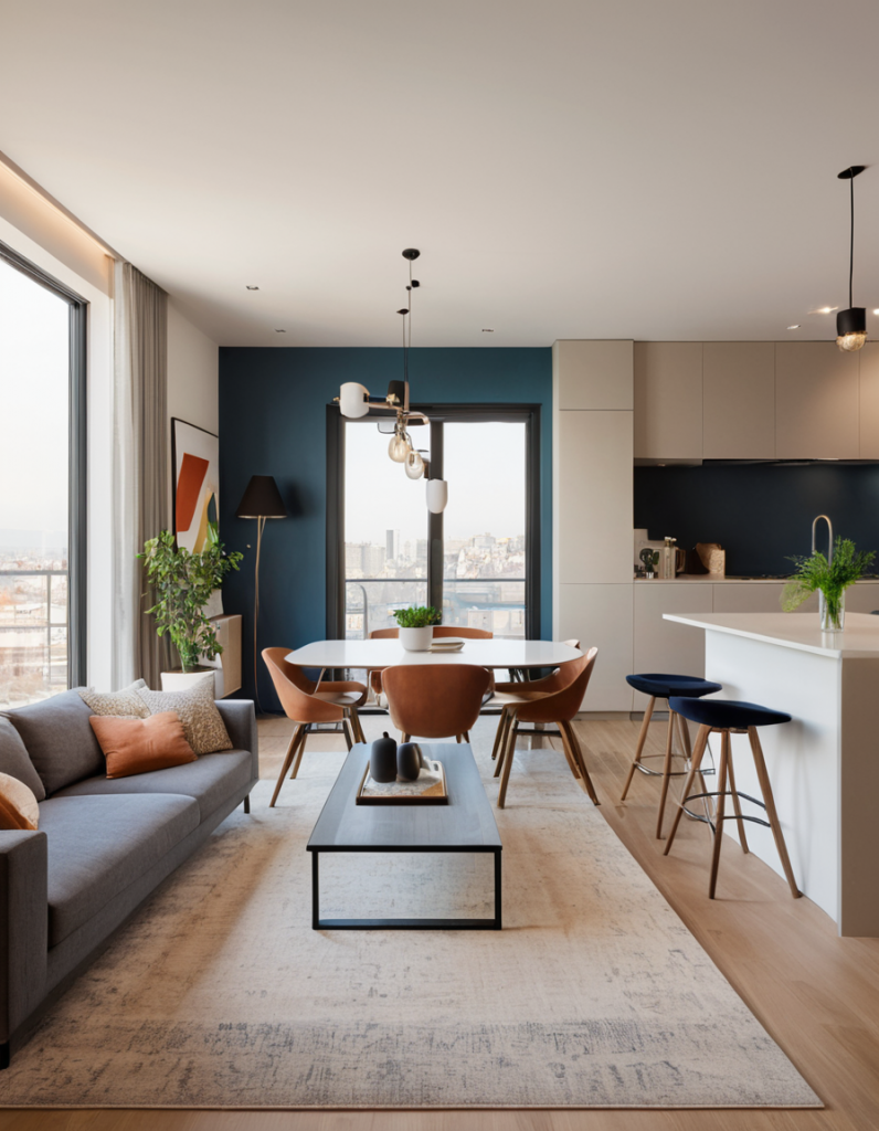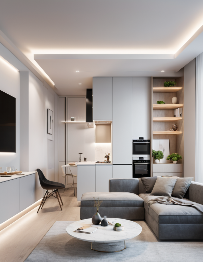One popular approach in decorating the open concept kitchen, dining, and living room is to arrange the spaces in an integrated manner. Such a solution allows to blend cooking, eating, and sitting areas into one, thereby creating a single unit of a beautiful, airy space no matter the apartment’s size. The main characteristics of the design in 2025 revolve around the use of islands or breakfast bars to be the clever means of defining zones without having the need for walls, thus better mobility and interaction in the areas. To the forefront of the list of solutions, that use composite materials and colors alike to unite them, is creating a minimalist space by implementing a consistent design idea in a modern, small apartment house, the main character of the design.