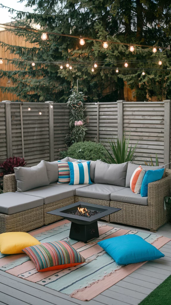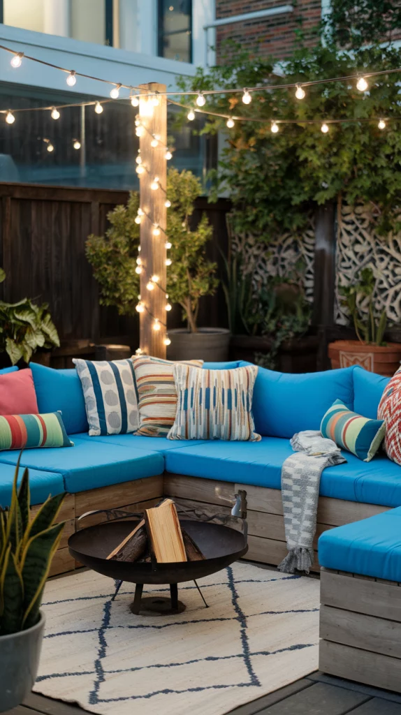 Create a cozy seating area with a mix of soft outdoor sofas, weather-resistant cushions, and a small fire pit or coffee table. Use corner spaces to tuck in benches or L-shaped sofas and complement the area with hanging lights or lanterns for ambiance. Add outdoor rugs and throw blankets to make it feel warm and inviting.