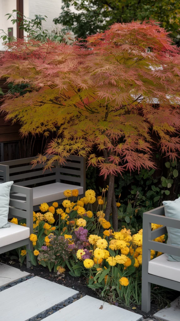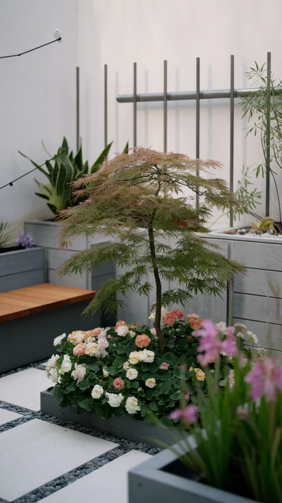 Opt for compact trees like dwarf citrus, Japanese maple, or ornamental cherry to add height without overwhelming the space. Position them strategically to provide shade or act as natural dividers. Underplant with flowers or ground covers to enhance the overall aesthetic.