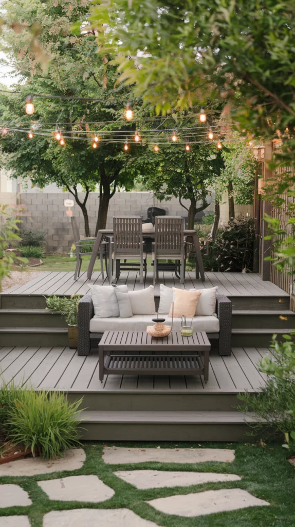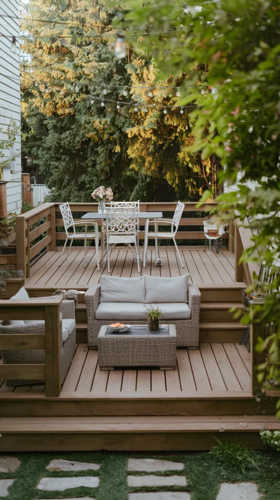 Multi-level decks add depth and functionality to small yards by dividing the space into zones. Create an upper level for dining and a lower one for lounging, or use steps to create a seamless flow between sections. Use wood or composite materials in warm tones for a natural and inviting look.