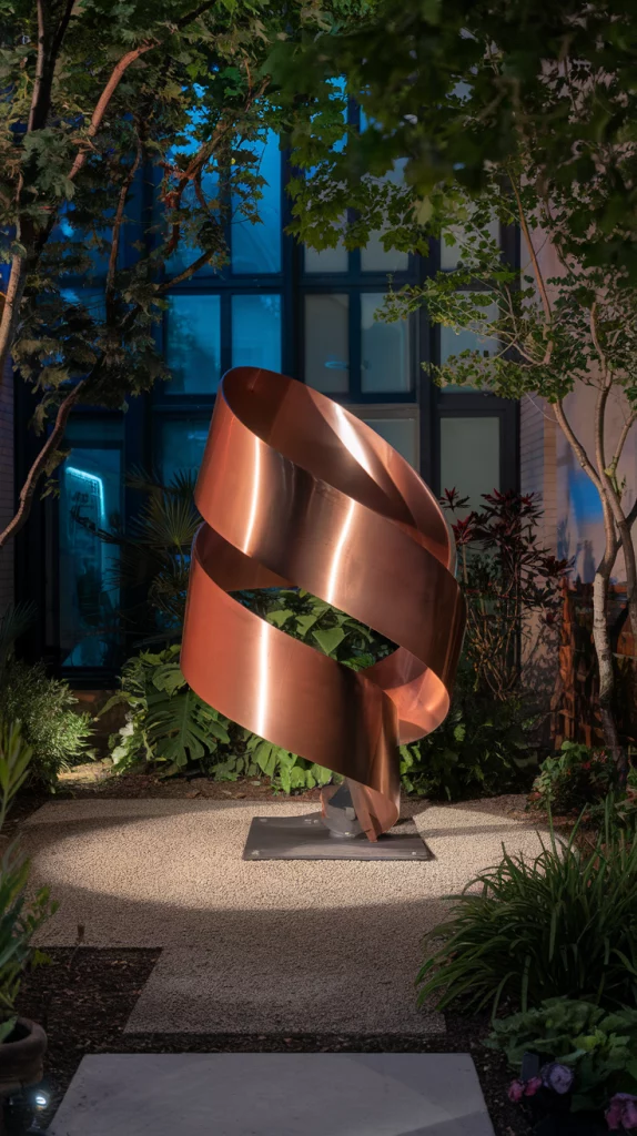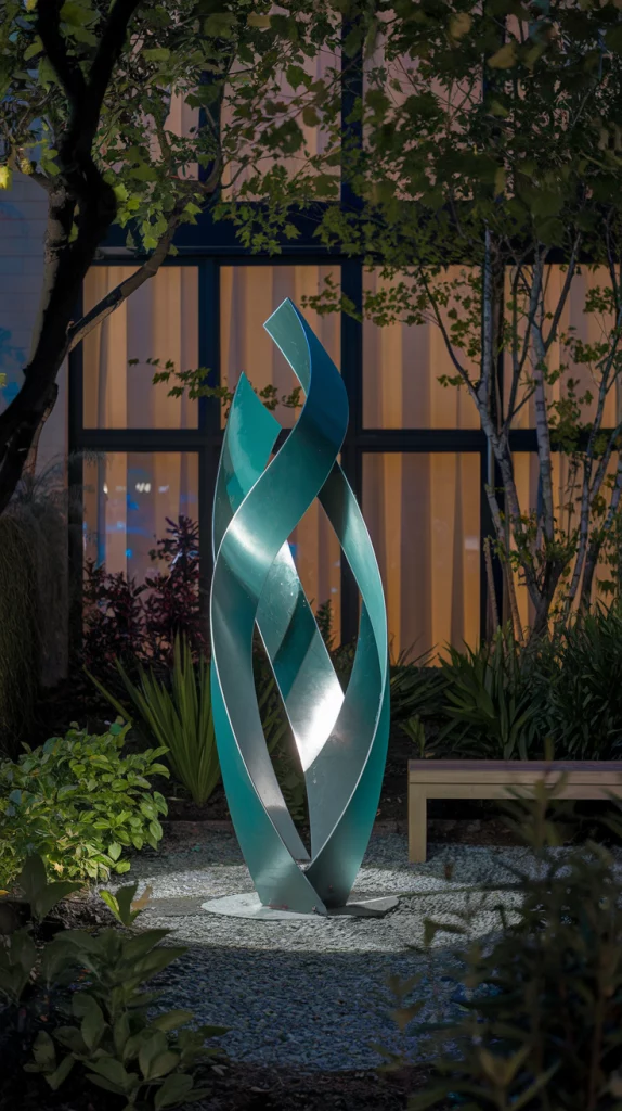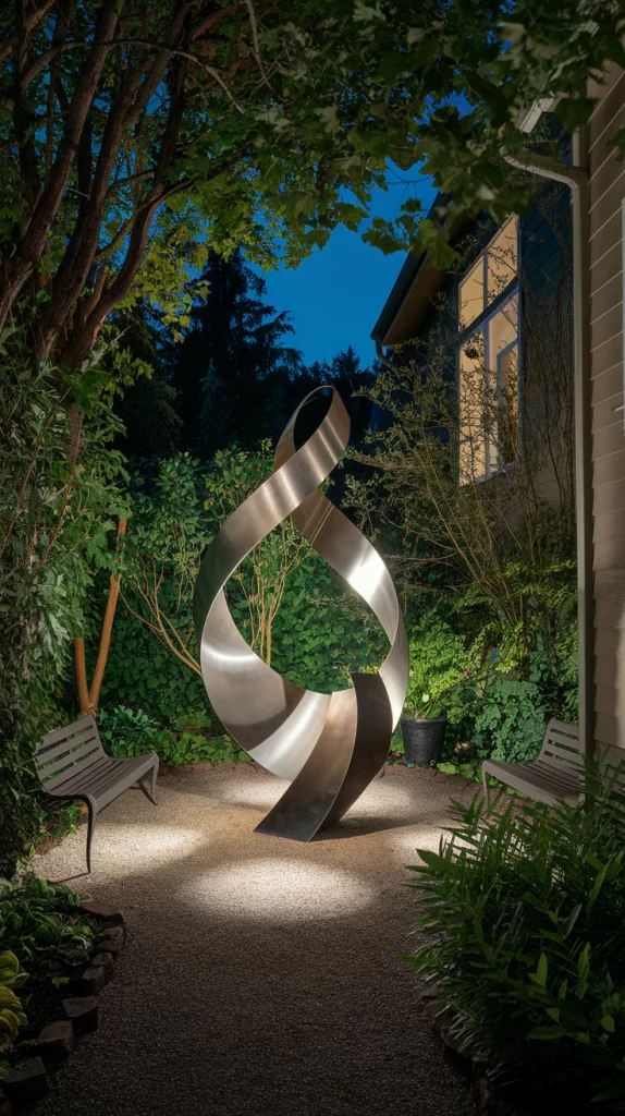 Art and sculptures can act as focal points in a small backyard. Opt for sleek, modern pieces like metal sculptures or abstract art, and position them in open areas for maximum impact. Use lighting to highlight these pieces at night, and balance them with plants and natural elements.