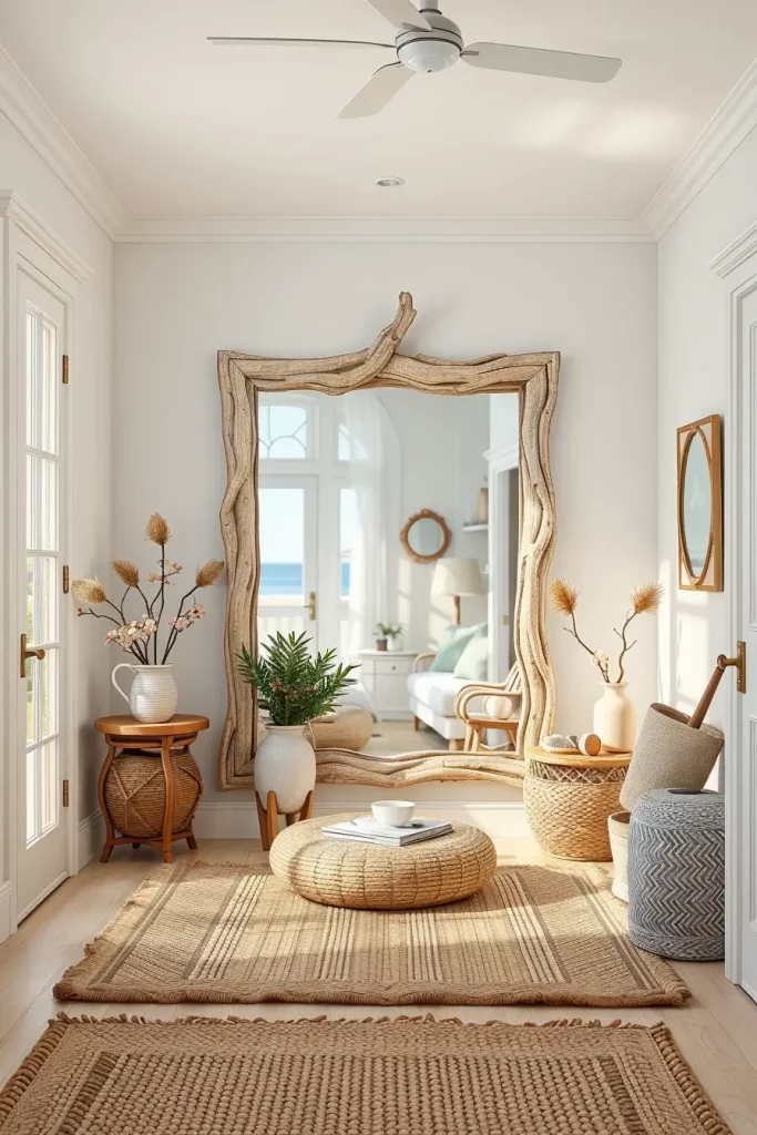 I choose to install big statement mirrors with driftwood or whitewashed frames that I place directly across from windows whenever possible. The cottage receives subtle light amplification from small mirrored decorations such as mirrored furniture and decorative mirror panels.