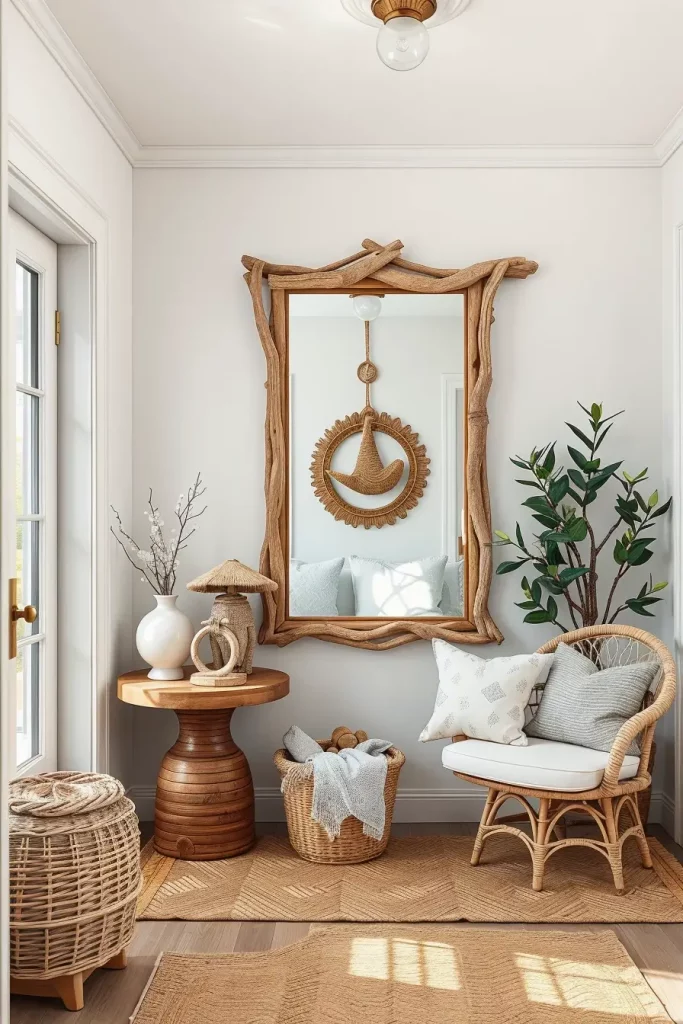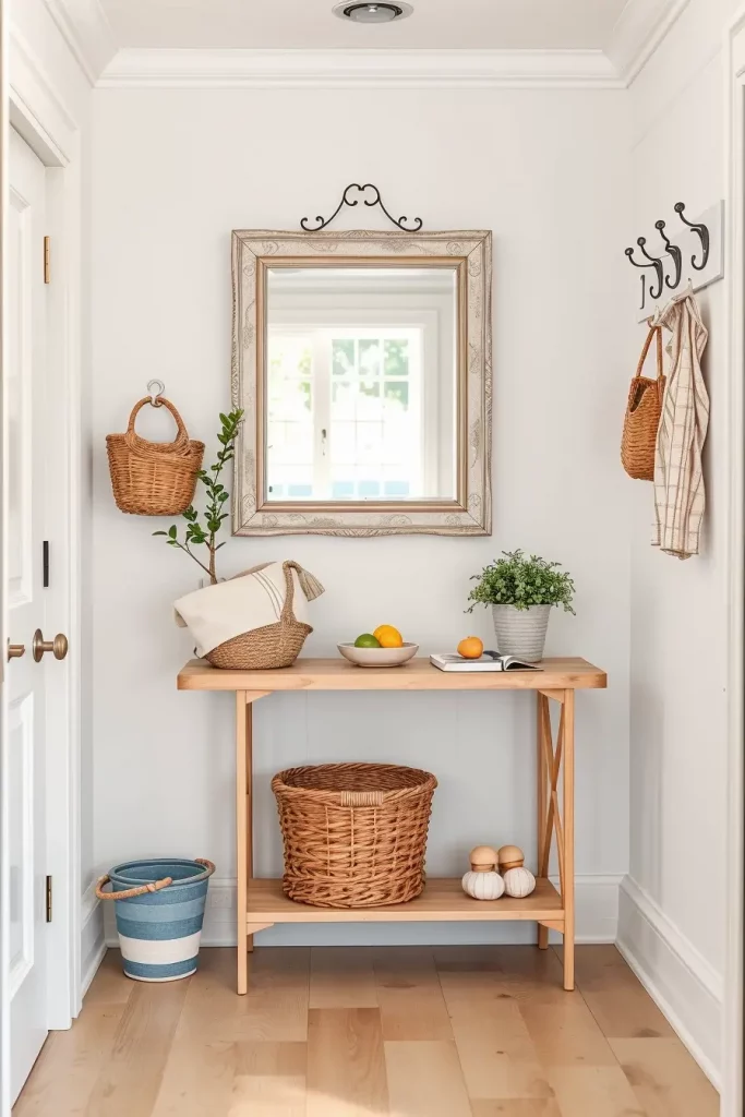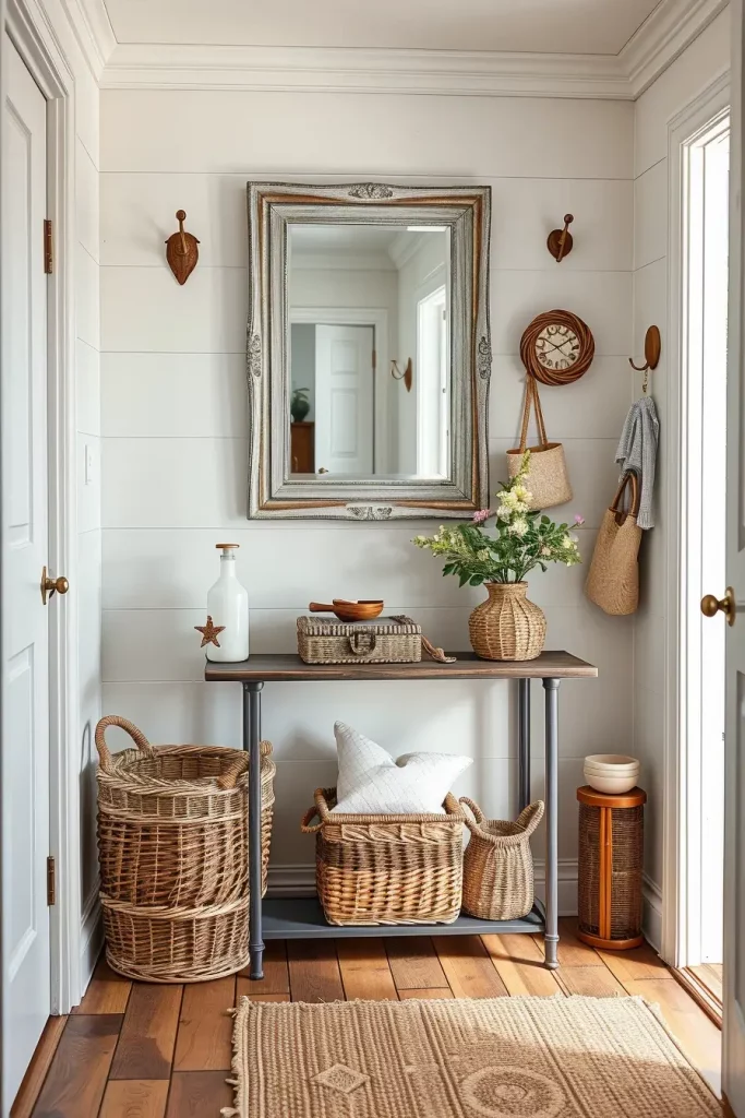 I organize beach essentials through the combination of wall-mounted hooks and woven baskets and slim console tables for flip-flops and hats along with beach bags. A mirror serves as an essential item since it reflects light to create additional illumination and provides you with a quick check before leaving.