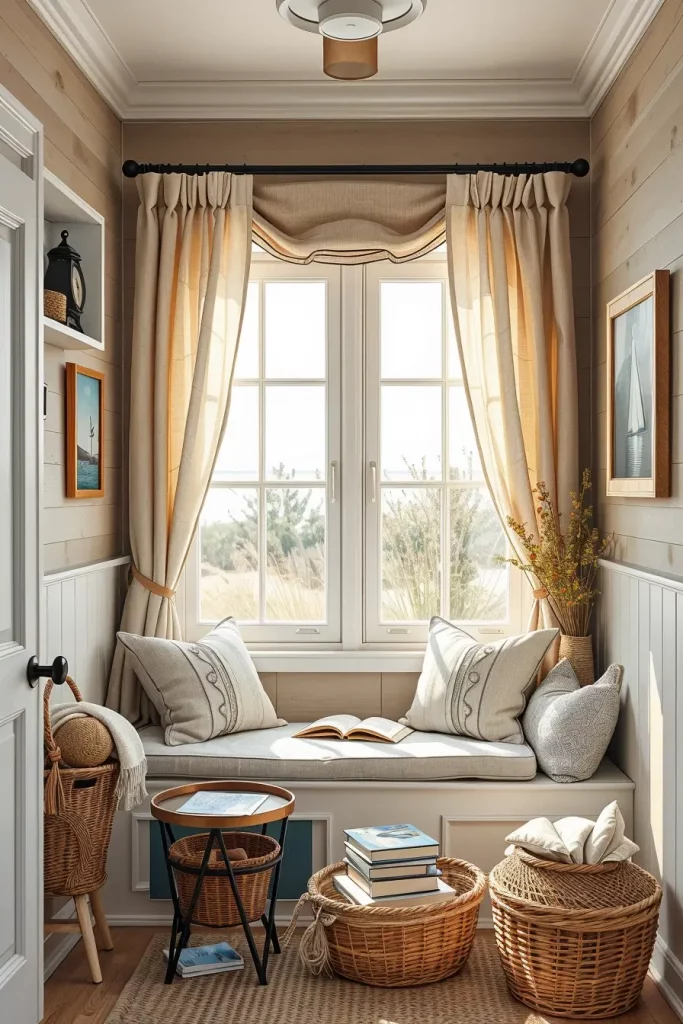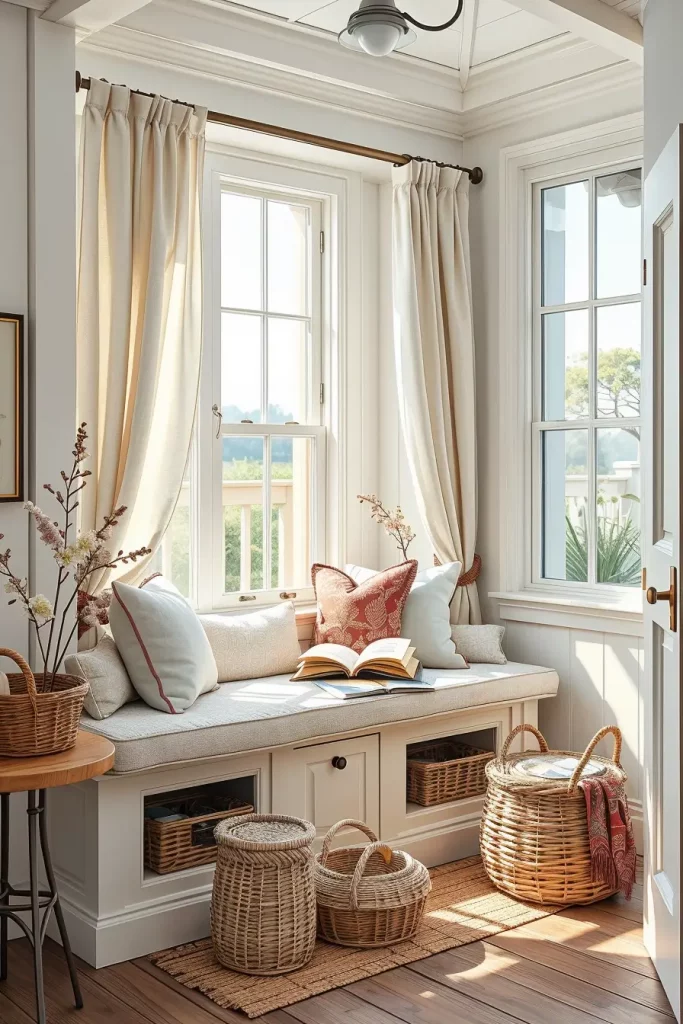 A small beach cottage interior reaches its peak with a comfortable reading area situated next to windows. I design peaceful little seating areas which give readers the opportunity to read their books while soaking in sunlight and fresh ocean airs.