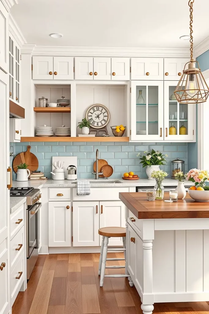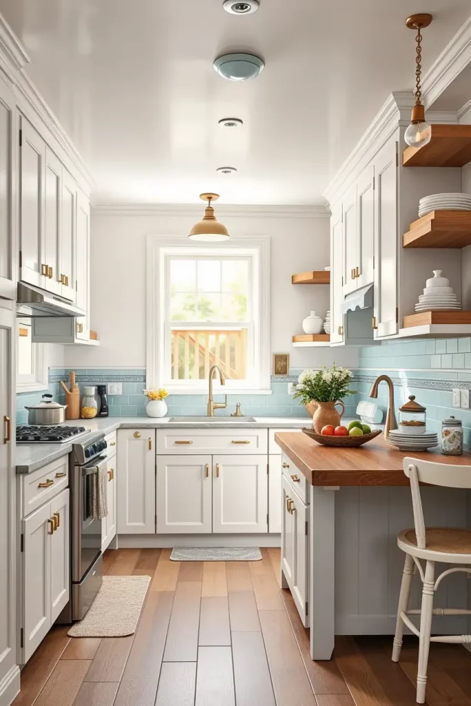 Shaker-style cabinets painted in soft white or pale blue should be used with open wood shelves that showcase pretty dishes alongside coastal decor. A small portable island serves as additional preparation space without creating clutter in the room. The coastal look reaches completion through the addition of shell-shaped hardware and sea-glass hues used for backsplash installation.
