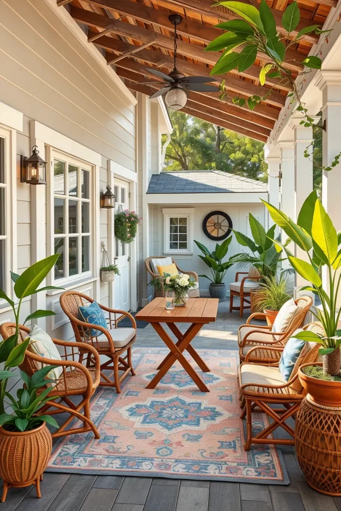 The design elements in my work include slimline rattan chairs together with foldable teak tables and built-in benches that have waterproof cushions. Outdoor coastal-toned rugs serve to center the seating section and along with tropical plants in planters add gentleness to the setup. Lighting plays a crucial role in space extension because fairy lights or overhead fixtures allow you to use your space longer into the evening hours.
