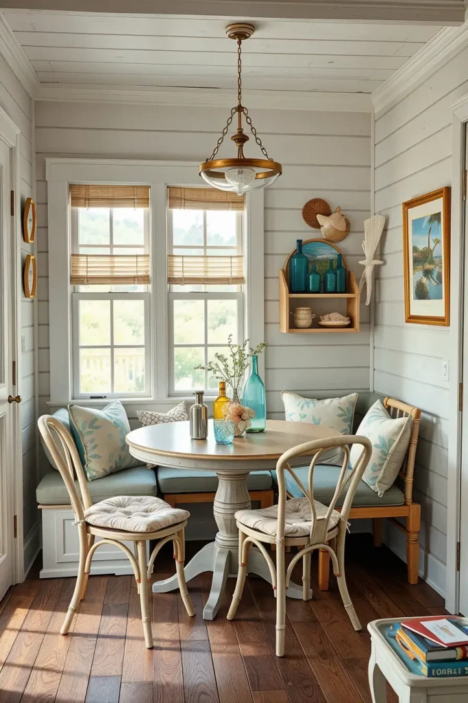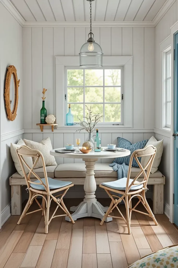 I would add built-in banquette seating which features hidden storage areas beneath the seating when I expand this design. The combination serves as an efficient method to create spaciousness while maintaining coastal cottage comfort.