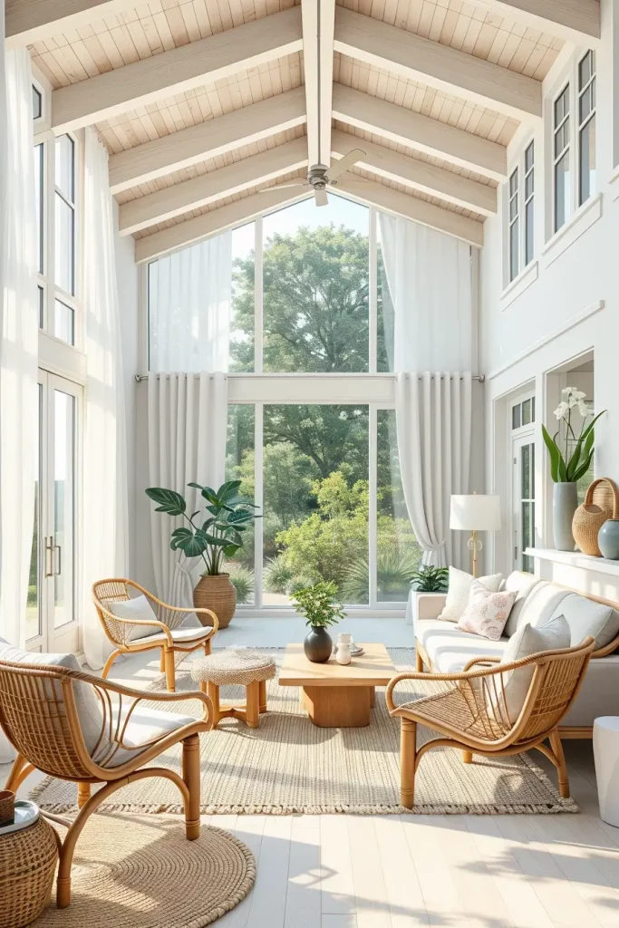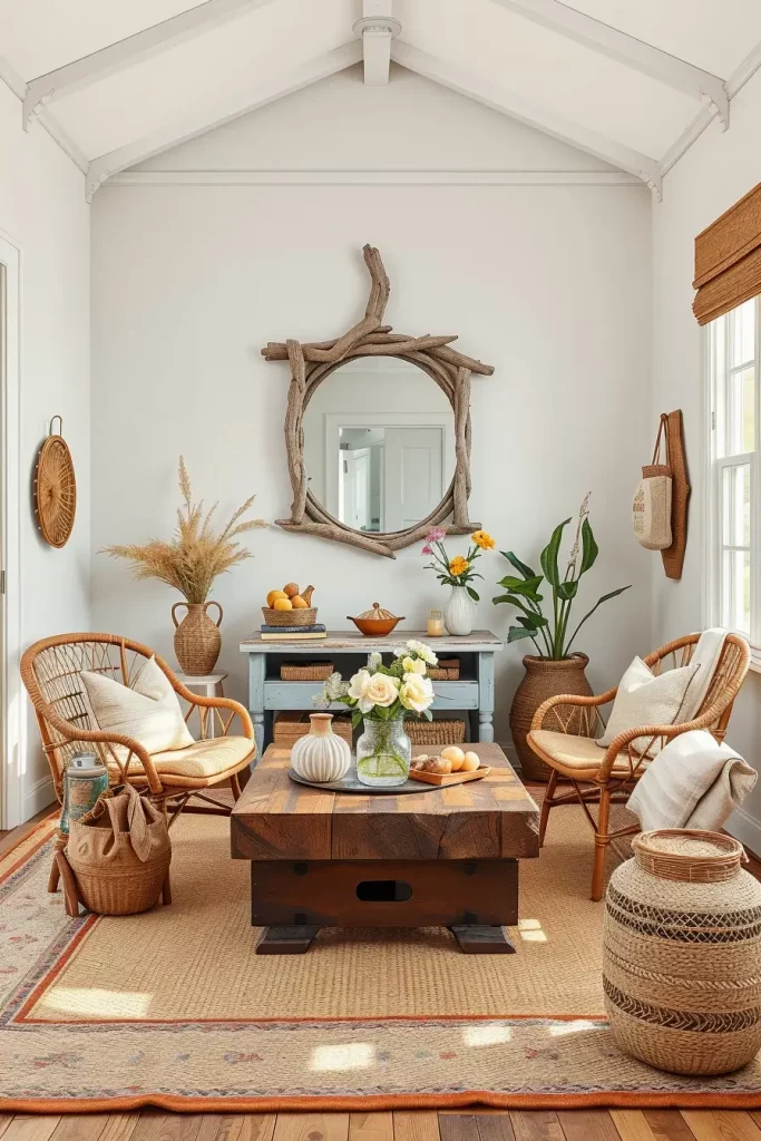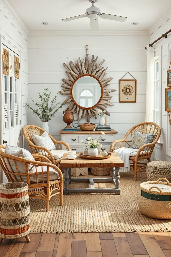 The design should include rattan chairs together with woven baskets and driftwood-framed mirrors and a reclaimed wood coffee table. Sisal and seagrass natural-fiber rugs function elegantly to ground spaces in addition to avoiding heavy and formal impressions. The desired relaxed atmosphere requires natural elements that avoid shiny or artificially processed materials.
