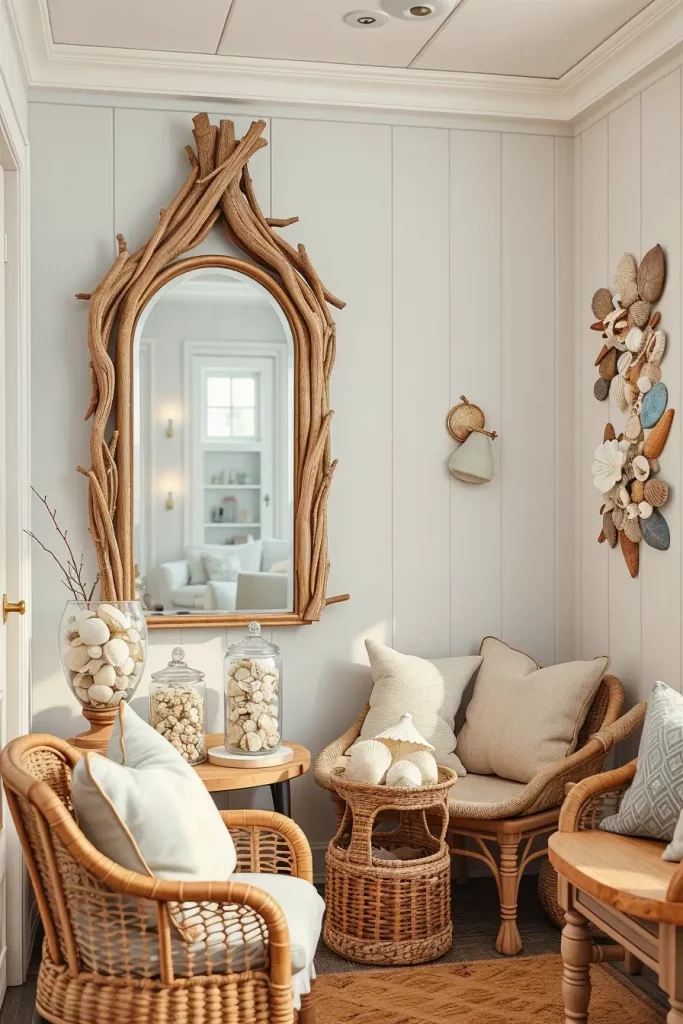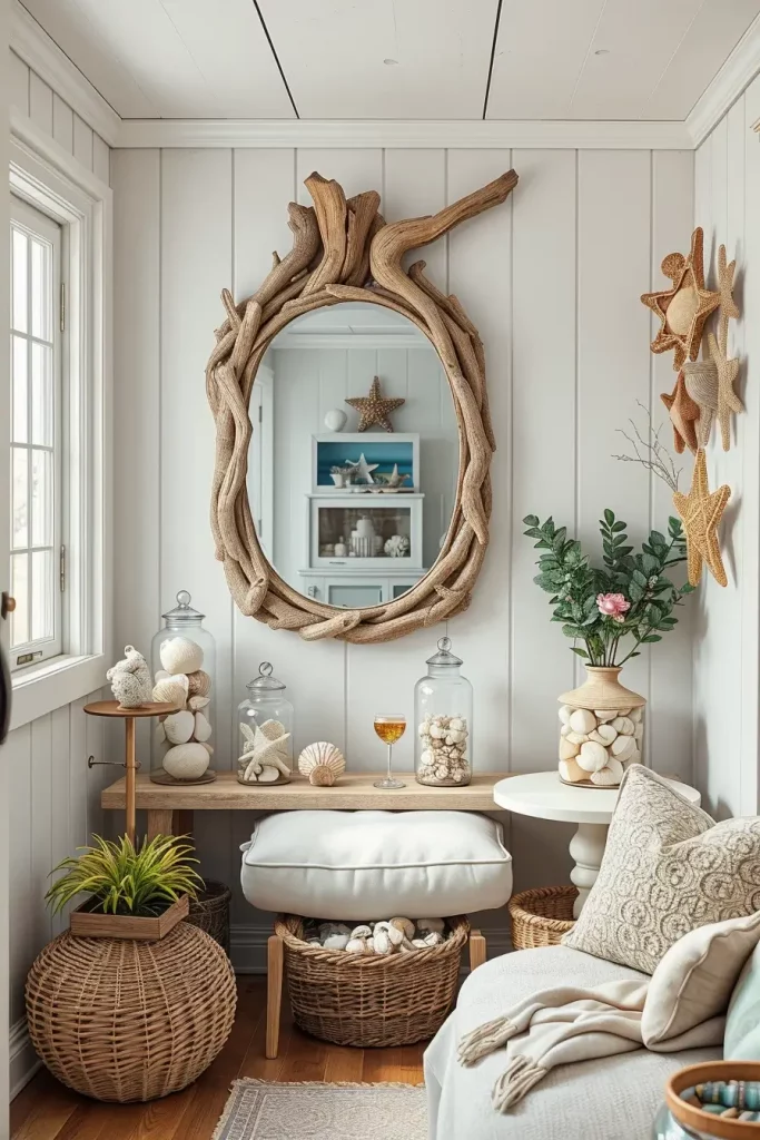 I use beach-found shells in glass containers and display driftwood mirrors above tables and create basic wall decorations from collected beach items. The personal objects establish a meaningful connection between the design and its coastal environment.