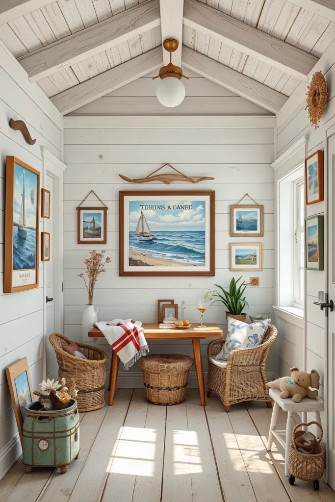 I like wall art that includes nautical maps in frames together with watercolor sea paintings and vintage postcards displayed in basic frames and large woven wall decorations made in sandy colors. I usually create gallery walls that blend different textures by including framed photographs together with driftwood elements and tiny shell sculptures to achieve a personal ambiance.