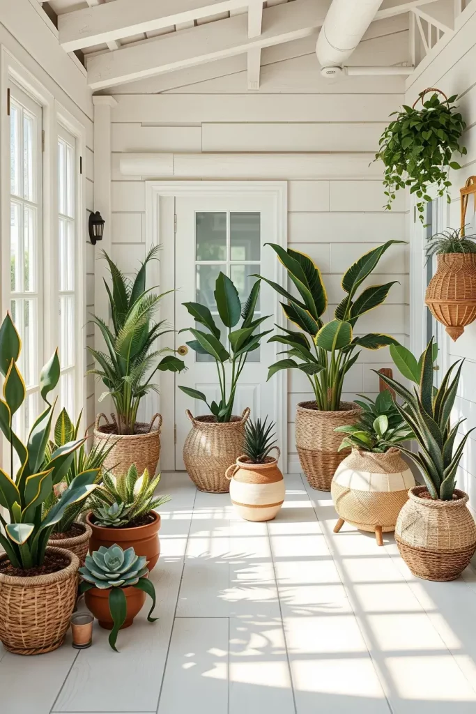 I would implement weathered clay or woven baskets as plant holders if I continued developing this design. Such decorative elements create perfect transitions within coastal spaces which successfully maintain the relaxed seaside atmosphere.