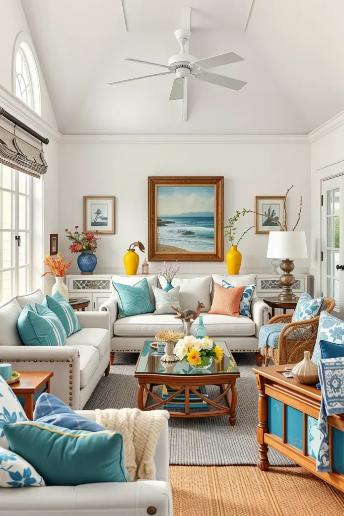 Blue-white patterned textiles along with coral-inspired sculptures and sunny yellow vases and bright aqua throw pillows integrate well into my décors. The beachy theme remains intact through artwork and ceramics and woven baskets which add colorful details to the space.
