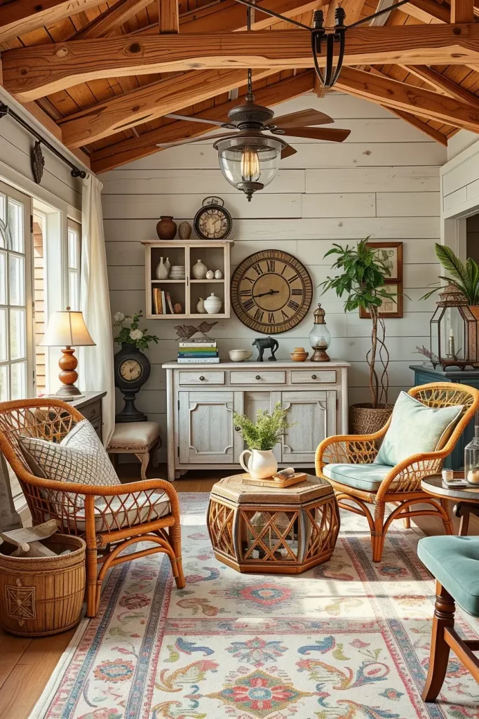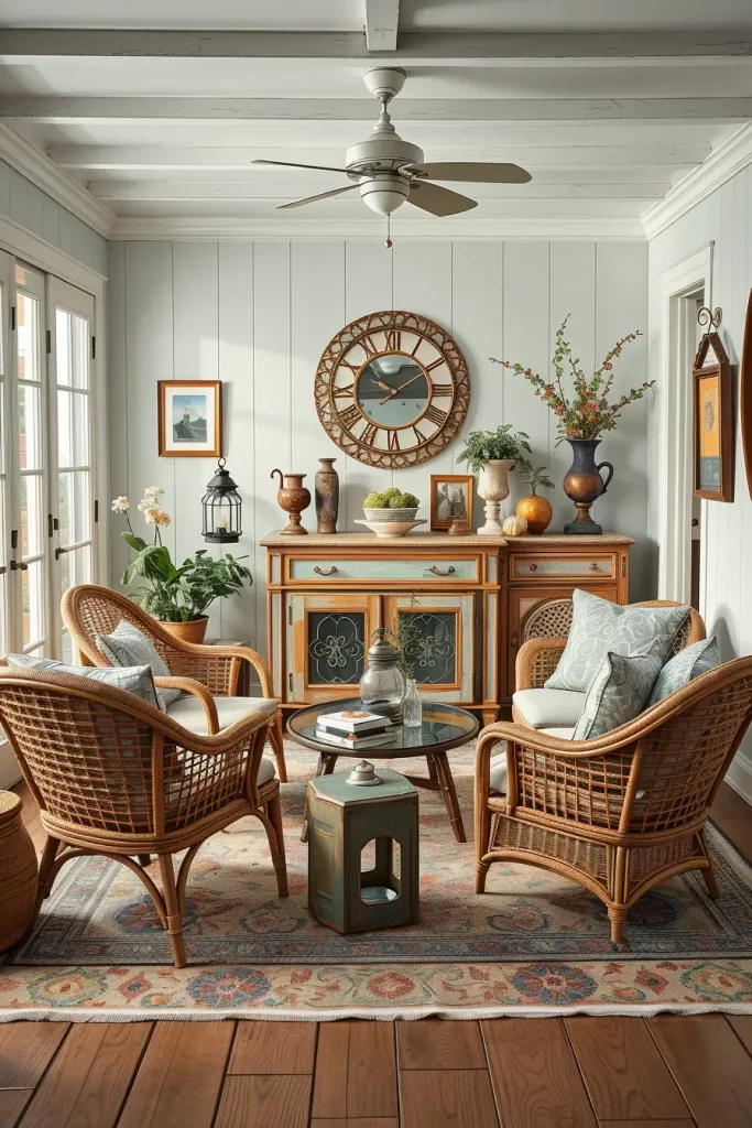 When designing beach cottages I integrate rattan chairs from the mid-century design era together with coastal retro artwork and antique sideboards and faded Persian rugs. The combination of a rusted metal lantern with a damaged enamel pitcher holding wildflowers creates light textured elements that bring history without overwhelming the space.