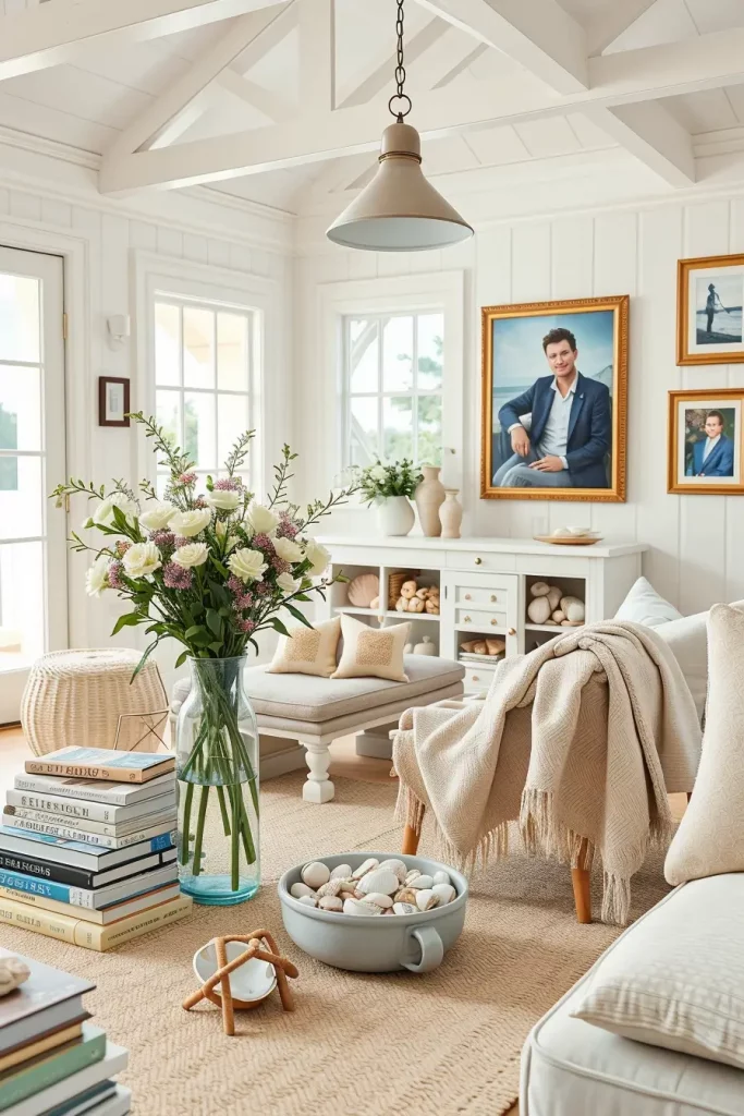 The charm of my small beach cottage reaches its full potential through my addition of throws across armchairs combined with fresh flowers in basic vases and beach-themed collections of books beside coffee tables supplemented by stone and shell ceramic bowls. Pictures of dear family beach memories in frames bring out a warm and personal feeling in the space.