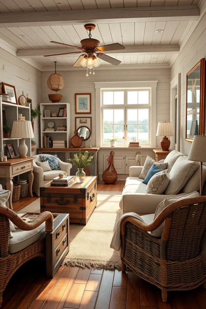 The style can be improved by introducing vintage-inspired clocks together with aged mirrors featuring patina or classic seaside antiques including vintage buoys and framed seafaring maps. They subtly whisper of the ocean’s timelessness.