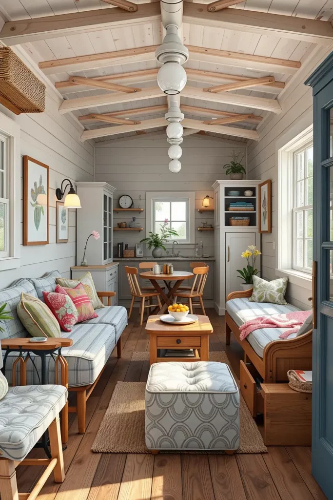 Designing compact multifunctional furniture stands as the most challenging yet satisfying aspect of creating interior spaces for small beach cottages. I seek furniture items which offer dual functions such as storage ottomans and convertible sofas and drop-leaf tables.